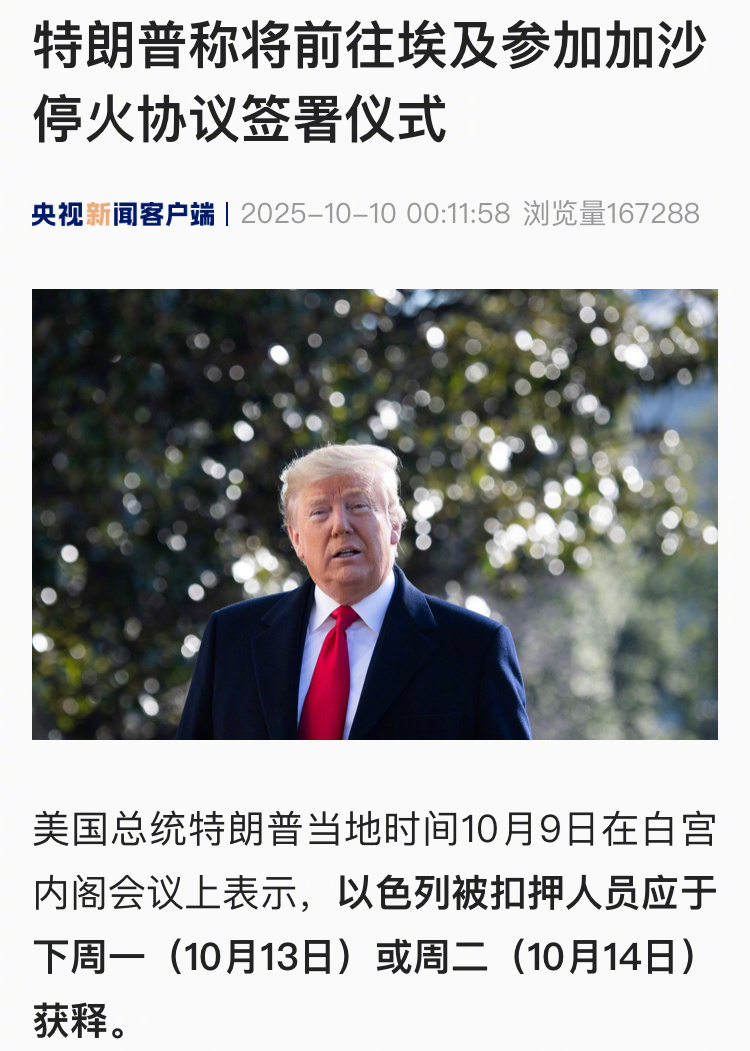 【特朗普称将前往埃及参加加沙停火协议签署仪式】美国总统特朗普当地时间10月9日在白宫内阁会议上表示,以色列被扣押人员应于下周一(10月13日)或周二(10月14日)获释。#以色列发出警告#