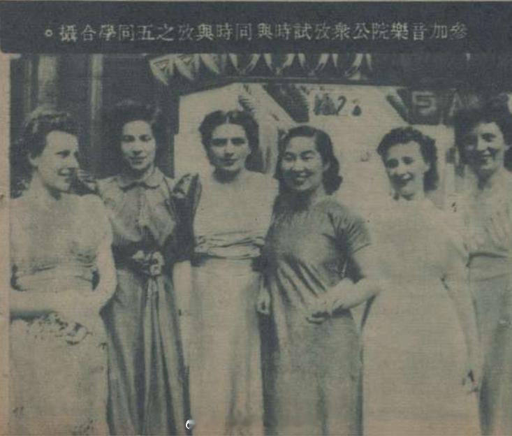 图2 :“音乐院同学多喜穿中国旗袍”(左三为郎毓秀)