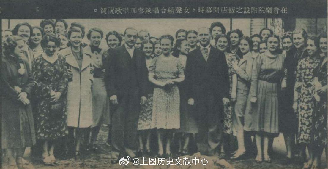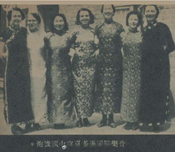 郎毓秀热爱祖国,身处异国校园,她从未改变东方风骨,反倒让旗袍成为跨越国界的语言,悄然在异乡播撒中国美学的种子。1941年,她写下一篇记录自己留学生活的《比都学歌记》,记录留学生活的点滴,文中配发的照片,鲜明地将这份文化坚守定格。在一张标题为“参加音乐院公众考试时与同时与考之五同学合摄”的场景里,她是人群中唯一的中国面孔,在一众身着洋装的同学中以一袭优雅旗袍从容而立,在这个参加考试的正式场合,她却以东方服饰自表,嘴角扬起的笑容自信又舒展,仿佛将祖国的荣光穿在身上,让东方的雅致在异国考场悄然绽放。另一张标题为“音乐院同学多喜穿中国旗袍”的照片,画面中,郎毓秀与六位外国同学并肩而立,人人身着旗袍,裙摆轻垂,线条温婉。她们手挽着手,笑靥如花,原来外国知识女性穿起旗袍,同样能演绎出优雅风韵,而这份对东方服饰的喜爱,分明是受她潜移默化的影响,她让旗袍成了连接不同文化的温柔纽带。还有一张“在音乐院附设之饭店开幕时女声合唱队参加唱歌祝贺”的照片,照片中可以发现图2中穿旗袍的几位外国女子,依旧身着旗袍站在队伍中。原来这一天,她们特意穿着旗袍登台演出,将对旗袍的喜爱,从日常延伸到了舞台之上。这不仅是一群高学识女性对中国服饰的认可,更藏着郎毓秀无形的影响力——她以一己之力,让旗袍走出国门,让东方美学在异国校园生根发芽,更让祖国的文化,借着一袭衣装,住进了更多人的心里。