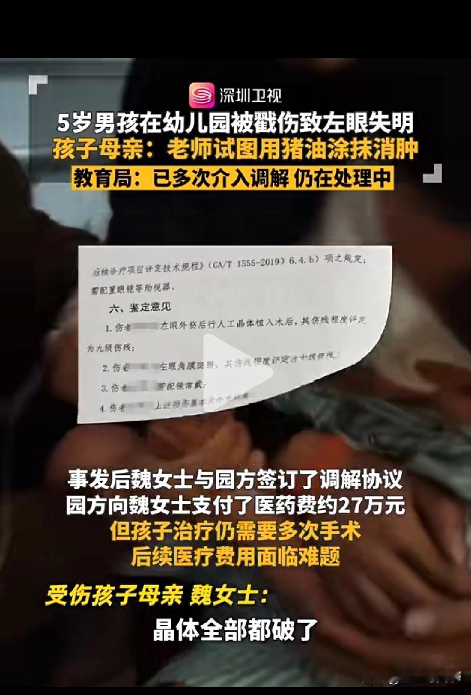 瑞昌市一5岁男童在幼儿园眼睛被戳伤造成失明!受伤时刻老师用猪油涂抹伤口说是为了消肿!到医院后检查晶体全部破裂并感染无法保住光明! 事后伤者的妈妈魏女士与幼儿园签订了调解协议,幼儿园向伤者妈妈支付了27万医药费,但孩子还需要多次手术,后续的医疗费用面临难题! 多么痛心!小小的年龄,命运一下子发生的转变,父母的身心该有多痛苦! 图片来源于网络