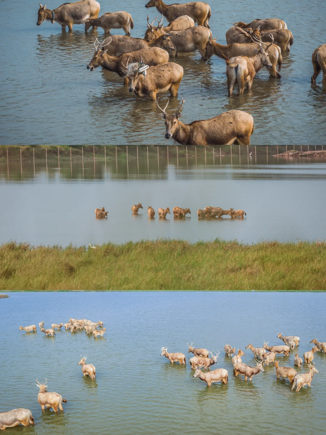 奔赴大丰,只为与“国宝”相遇。驱车抵达野鹿荡,穿行旷野,棕褐色的麋鹿甩着大角从芦苇丛钻出来——这些从英国“回家”的精灵,在阳光下晃着皮毛,倒像闯进了静谧的小草原。看它们结伴啃草、奔跑,连风都慢了下来。如果嫌距离太远,还可以去中华麋鹿园近距离投喂,傍晚回市区,转去东晋水城,红灯笼挂满廊桥,穿汉服的姑娘提灯走过,晚风都浸着温柔。