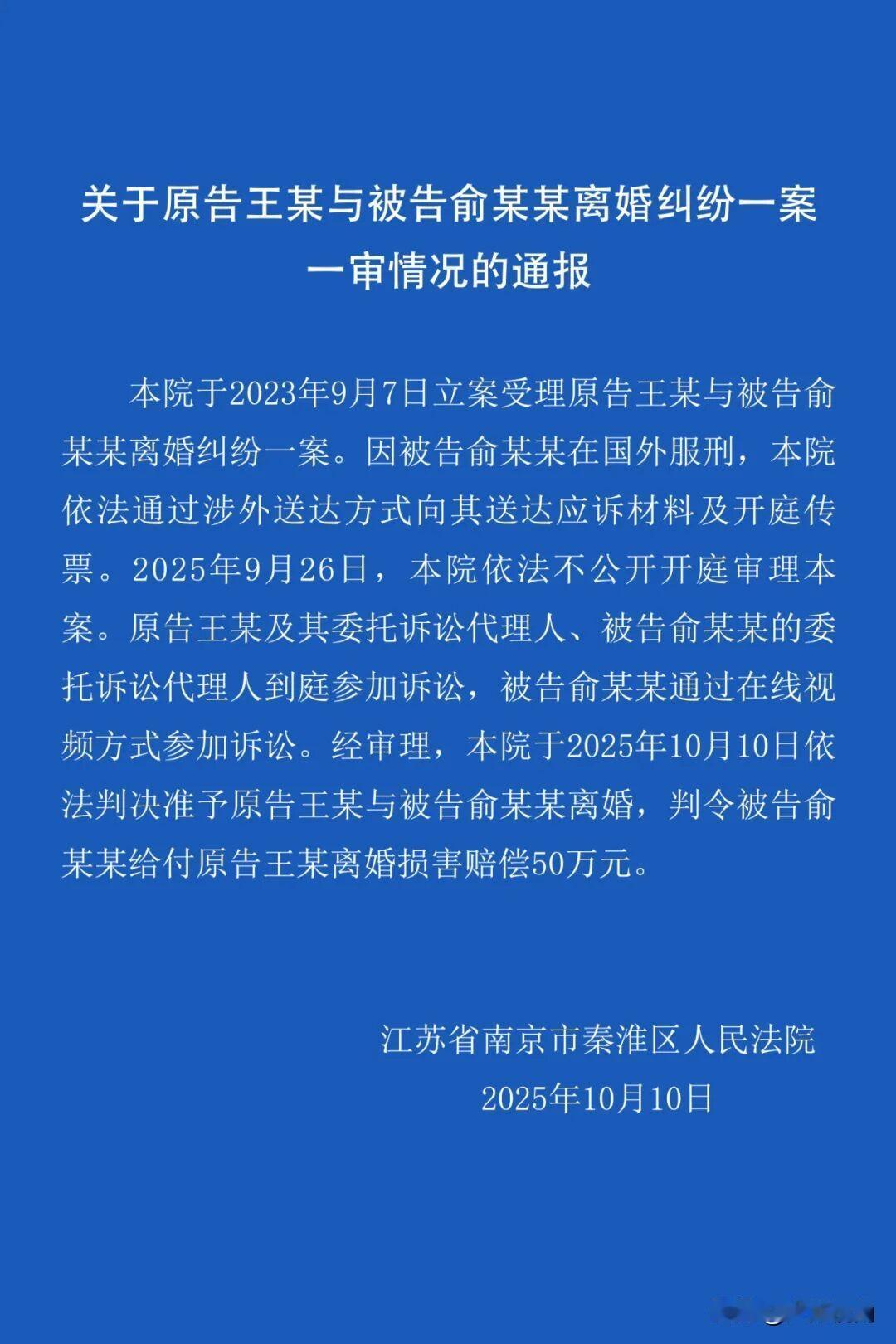 南京秦淮法院判了! 跨国服刑离婚案! 女方获50万损害赔偿 南京秦淮区人民法院今日通报一起离婚案:原告王某与在国外服刑的被告俞某某离婚纠纷,法院依法判决准予离婚,并判令俞某某给付王某离婚损害赔偿50万元。 案件于2023年9月立案,因被告境外服刑,法院通过涉外送达程序推进。2025年9月26日不公开开庭,被告在线视频参与,最终于10月10日作出判决。这一判决明确了离婚损害赔偿在涉外离婚案件中的适用,也体现了法律对婚姻中无过错方的权益保护。
