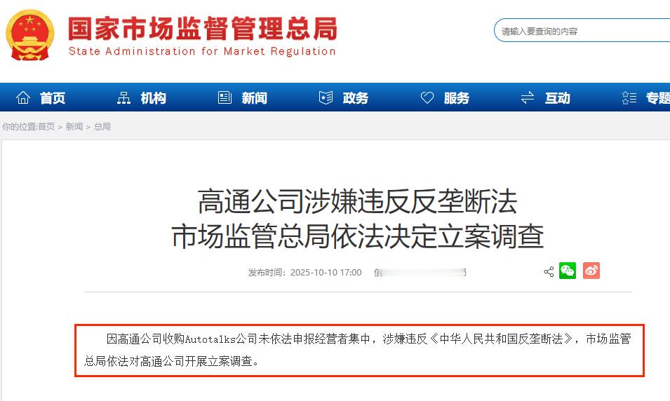 高通涉嫌违反反垄断法 因高通公司收购Autotalks公司未依法申报经营者集中,涉嫌违反《中华人民共和国反垄断法》,市场监管总局依法对高通公司开展立案调查。