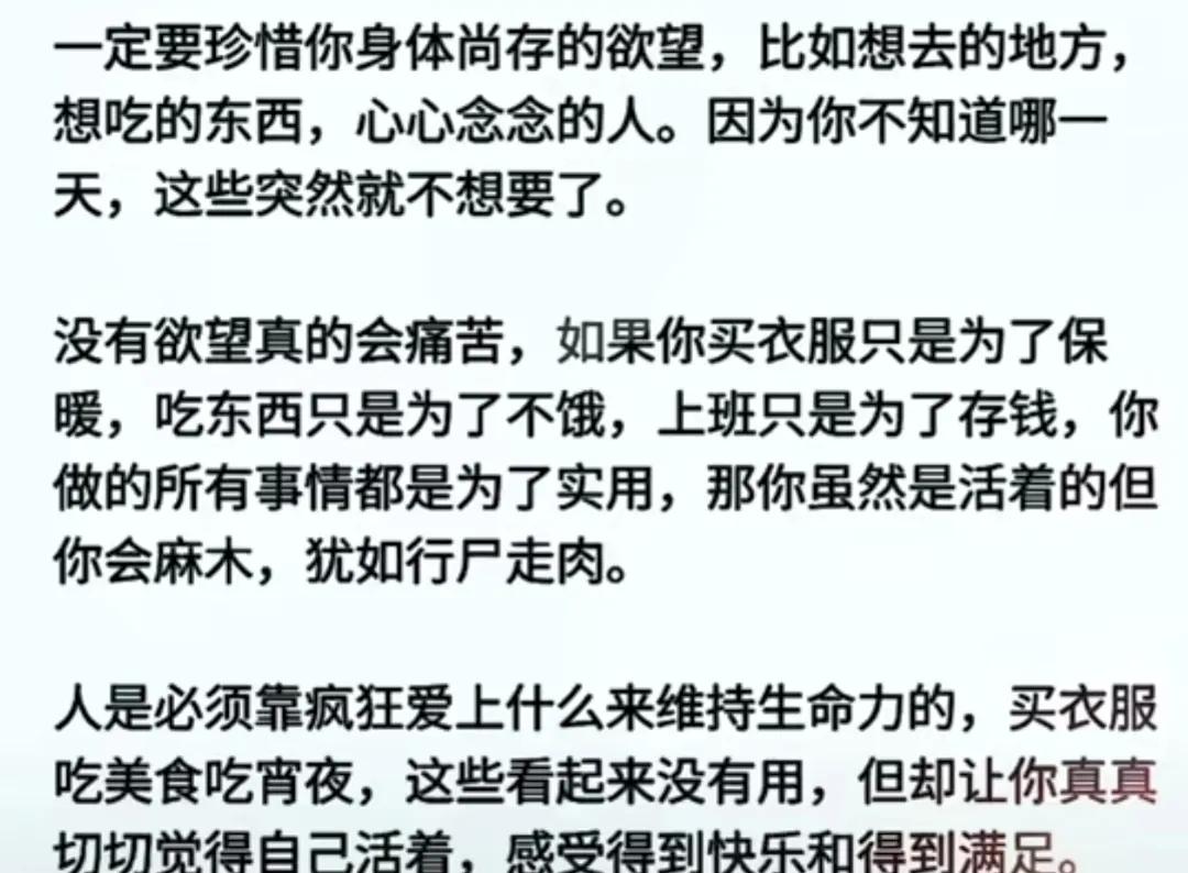 看了这段话 突然就觉醒了 年少的时候 我们想要很多东西 但是没能力去实现 长大了 我们有一点能力了 可是却没有太多想要的了 想吃的东西 突然就没那么想吃了 所以有点热爱 是多么幸福的事 让我们在这漫长的一生中 用热爱点一盏烛火 然后寻着这束热爱的光 可以蹒跚前行 相比起人欲无穷 清心寡欲才是可怕的