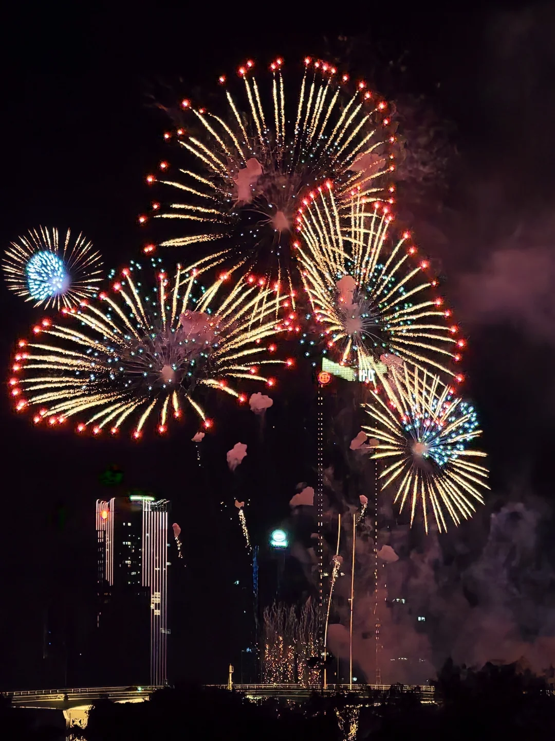 烟花在海面上空绽放,倒映着澳门塔与城市灯火🌌