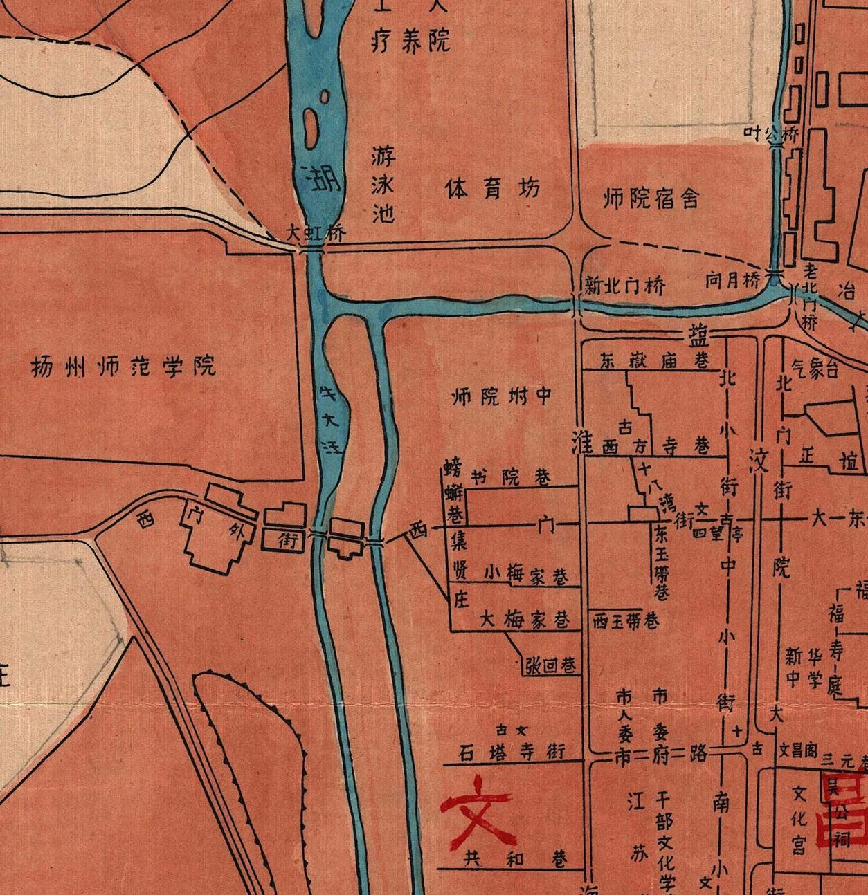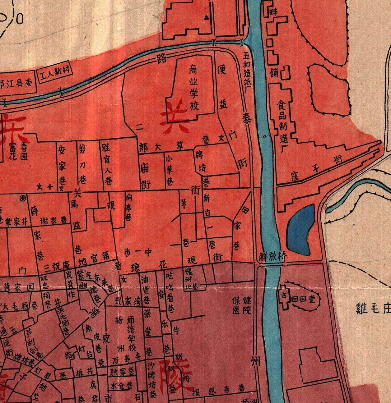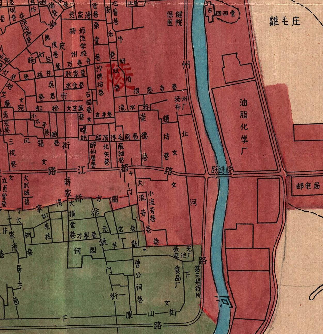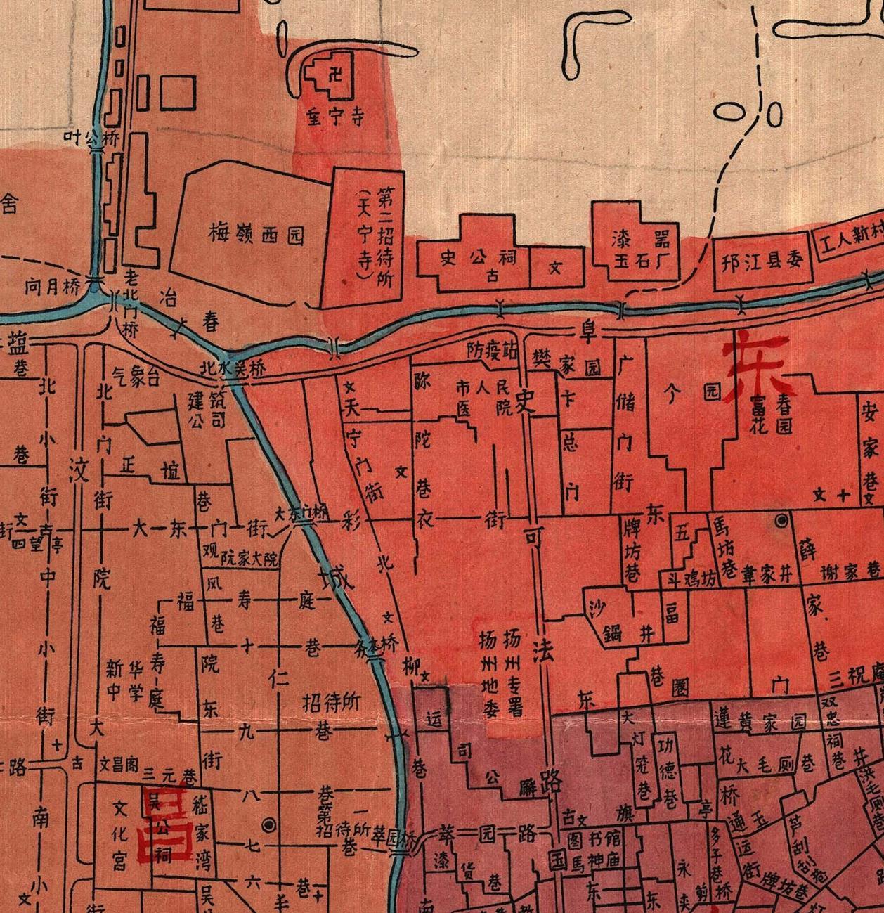 老地图中的城市记忆:1963年的扬州市区。该图为1963年12月制。扬州是首批历史文化名城,其发展贯穿数千年华夏史,脉络清晰。先秦时期,扬州属古九州之一,春秋时为邗国都城,吴王夫差开凿邗沟(京杭大运河前身),奠定其水运枢纽地位。汉代设广陵国,经济初兴;魏晋南北朝虽历经战乱,仍是江淮要地。隋唐至宋元是扬州鼎盛期:隋代大运河贯通后,其成为 “南北漕运咽喉”,唐代更跃升为全国经济都会,商贾云集、胡商聚居,有 “扬一益二” 美誉;宋代依托漕运与盐业,持续繁荣,成为文人荟萃之地。明清时期,扬州因盐业专营达至巅峰,盐商