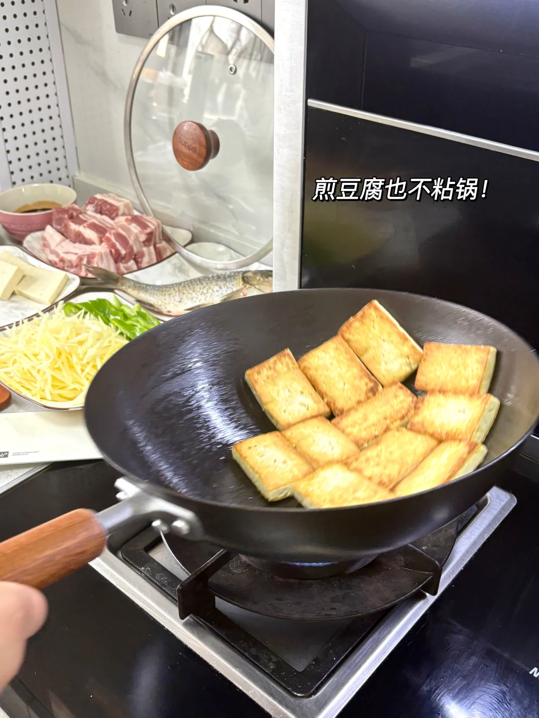 我试了下,煎豆腐、煎鱼都不带粘的!
