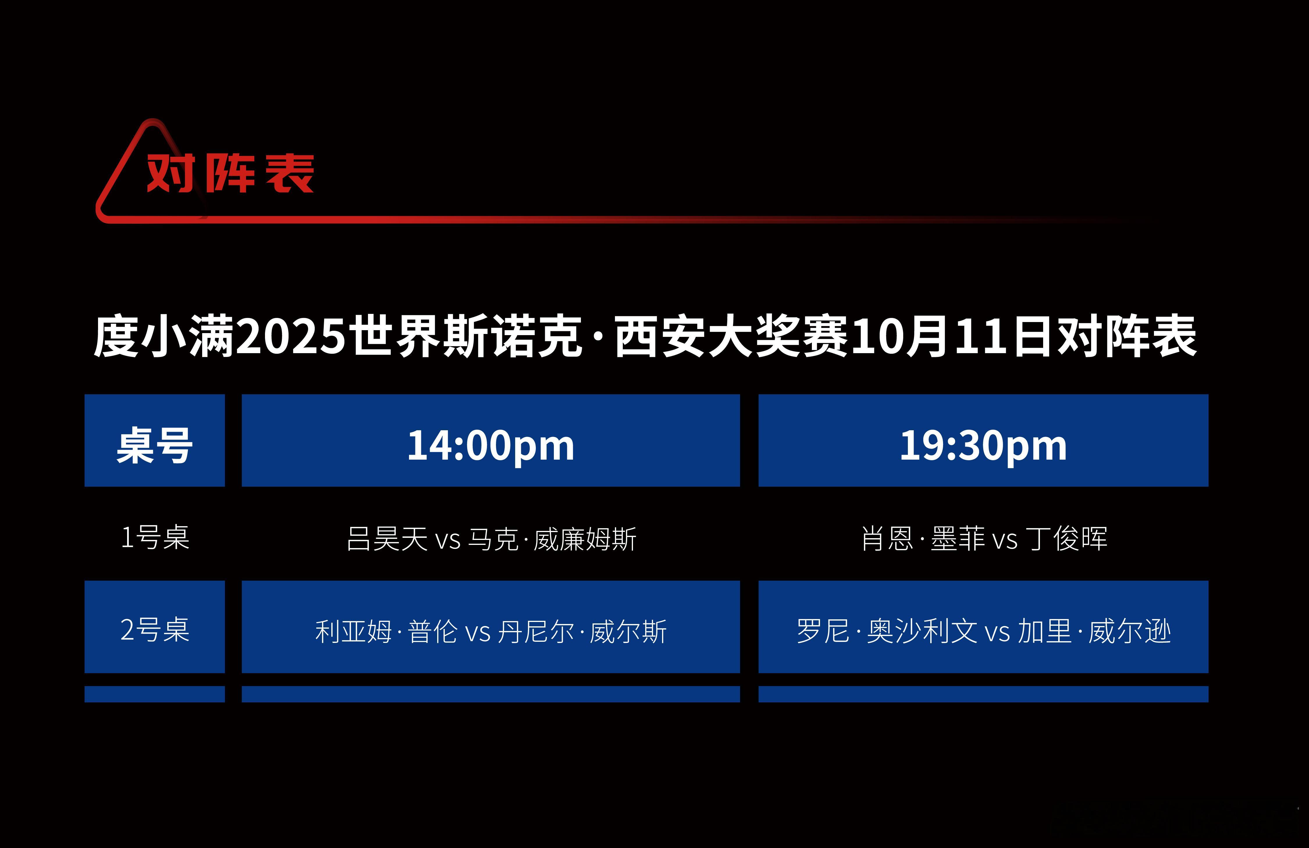 2025斯诺克西安大奖赛10月11日14:00吕昊天VS马克-威廉姆斯、利亚姆