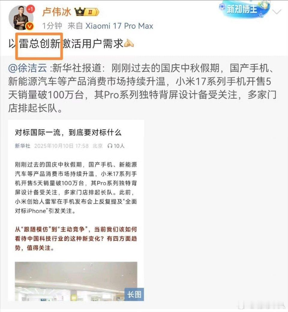 小米总裁卢伟冰:“以雷总创新激活用户需求”。