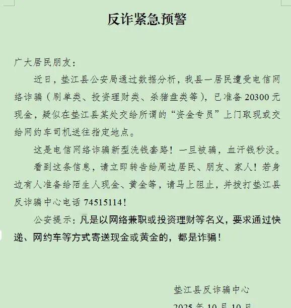 “资金专员”上门取现?垫江又一居民被骗!注意防范