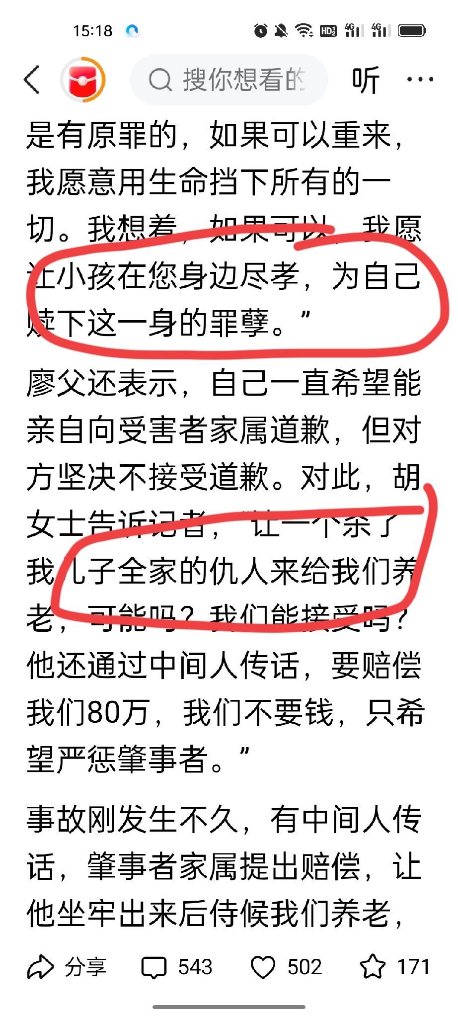 真是奇葩思维! 去年十月江西景德镇发生了一起惨烈的车祸,廖某因为跟女友吵架,开起了斗气车。在限速40公里路段,开到了128.9公里。结果撞到了正在过马路的胡某一家三口,造成了三人殒命的悲剧。 胡某而立之年,又是家中独子,这起车祸让老胡夫妇顿时成为失独老人。事发后廖某被刑拘,廖父托中间人找到了老胡,说愿意赔偿八十万元,并且答应在廖某出狱后,给老胡夫妇养老送终。 真是亏他想的出来!如果真达成协议了,老胡夫妇看着害死自己儿子一家的人,天天在身边晃悠,该是什么心情? 据说老胡夫妇拒绝了调解,他们唯一的愿望是按照危害公共安全的罪名,来追究廖某的责任。