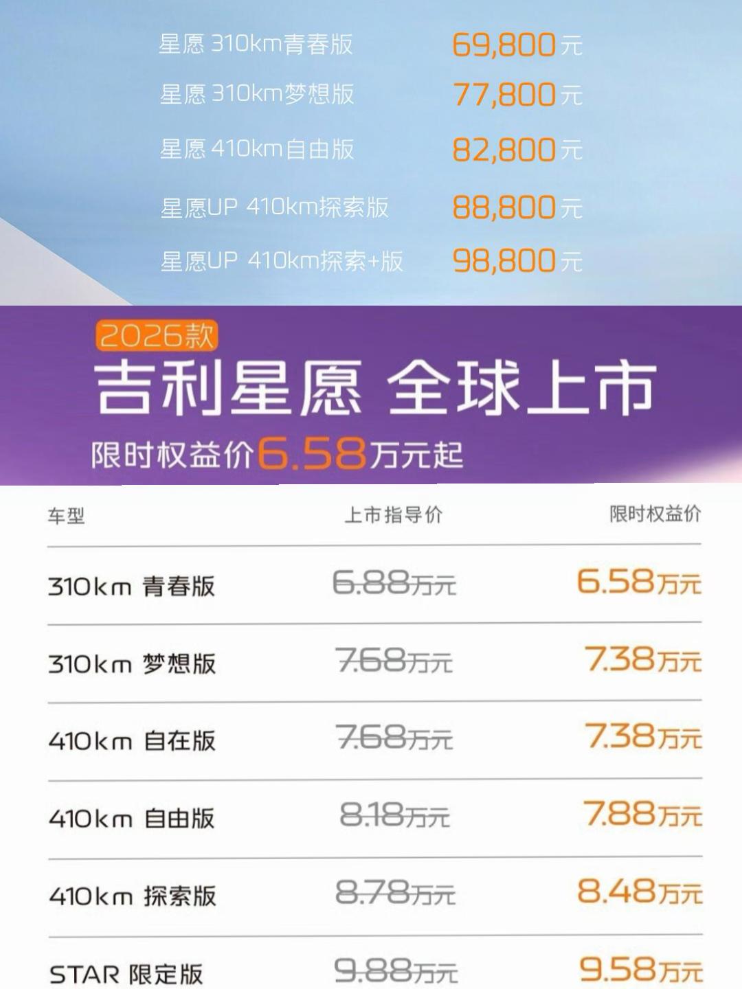 2026款吉利星愿上市,比目前在售版本又便宜了,限时权益价6.58万元起,还推出了STAR限定版。【来自懂车帝车友圈】