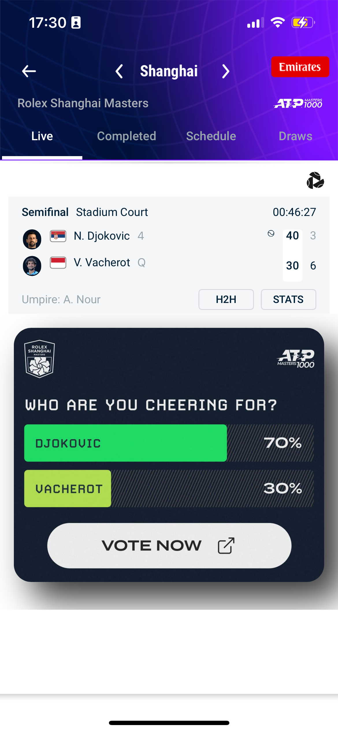 2025上海大师赛德约科维奇3-6掉了第一盘!
