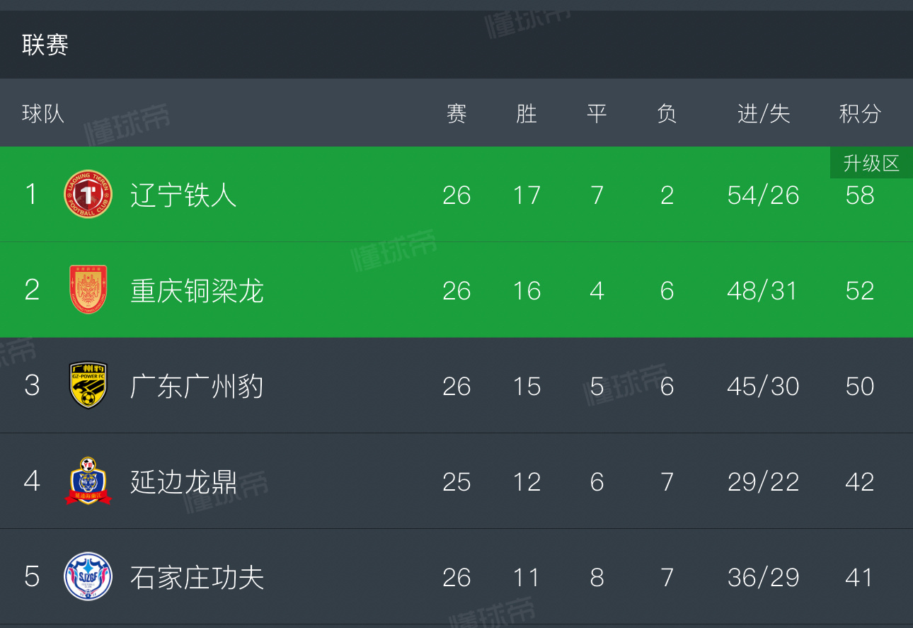 今晚辽宁铁人2:1击败了石家庄功夫,广东广州豹4:1南京城市,重庆铜梁龙2:0佛山南狮。冲超集团的三支球队目前辽宁铁人优势明显,重庆和广东相差2分,未来还有四轮联赛,看看谁能冲超成功吧