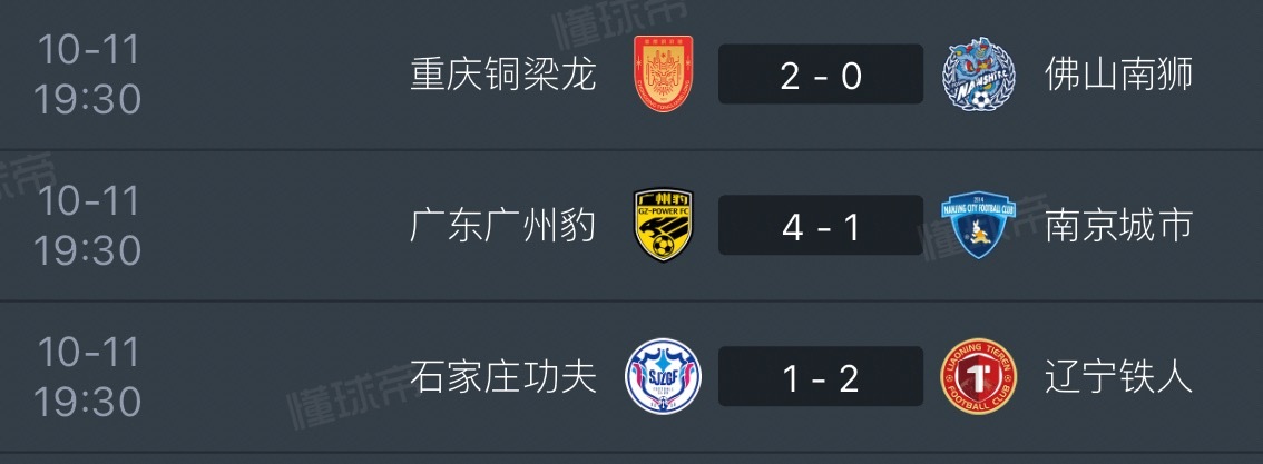 今晚辽宁铁人2:1击败了石家庄功夫,广东广州豹4:1南京城市,重庆铜梁龙2:0佛
