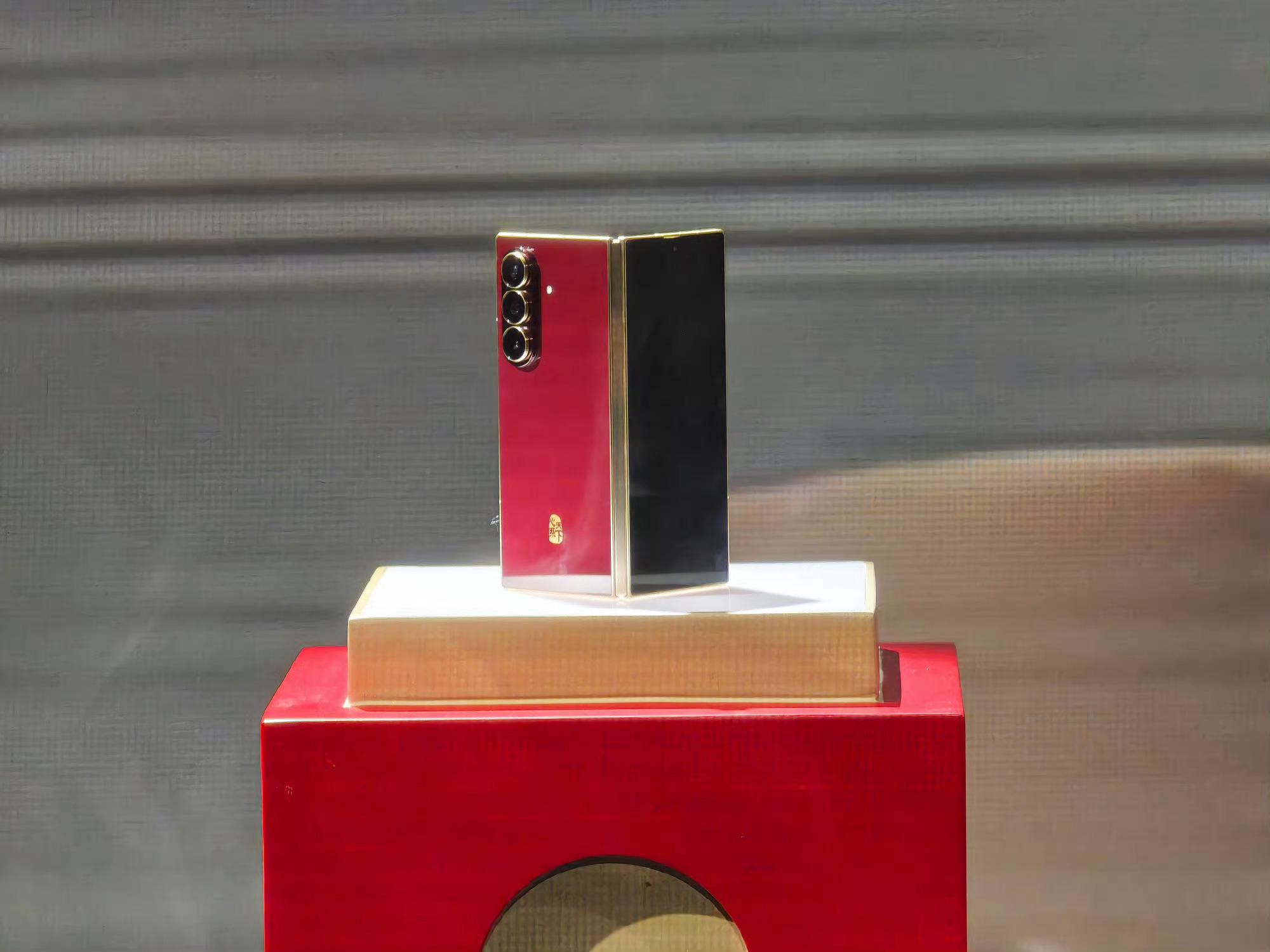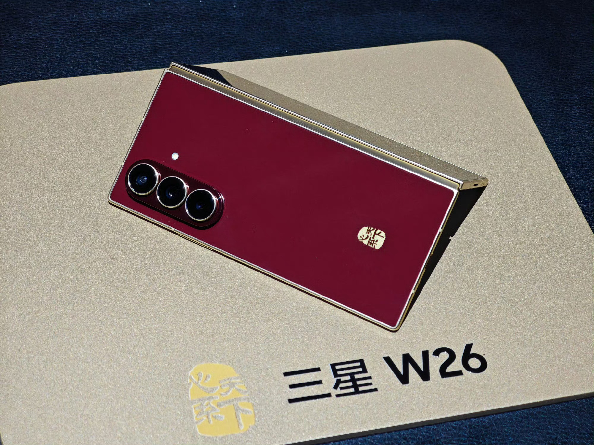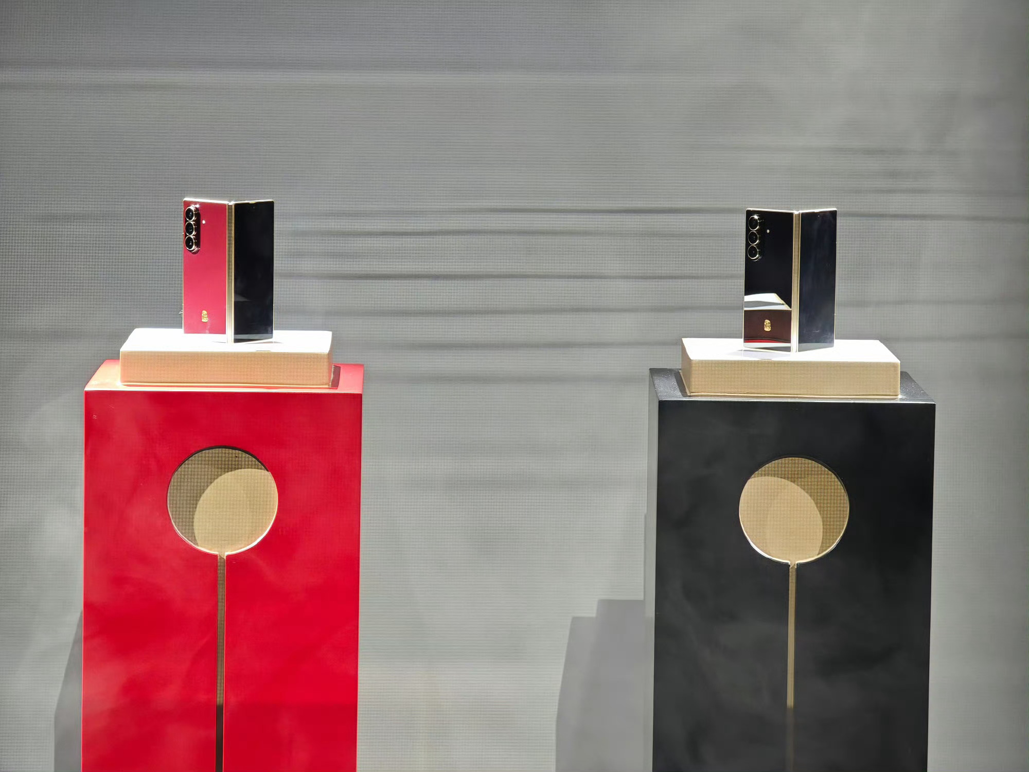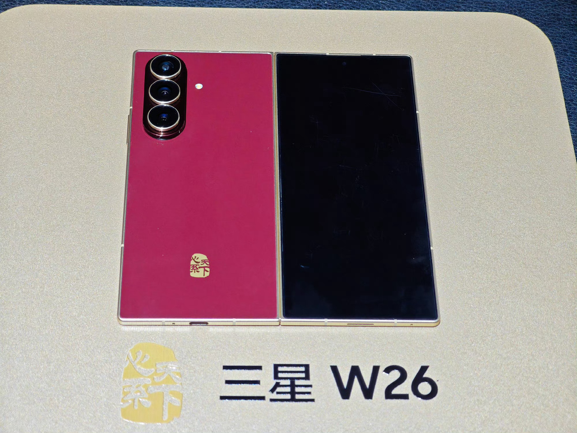 三星W26,玄曜黑和丹曦红两个配色,针对中国市场,很有东方美学的美感,看起来有一种高端、典雅感觉,价格也很高贵,16999元起