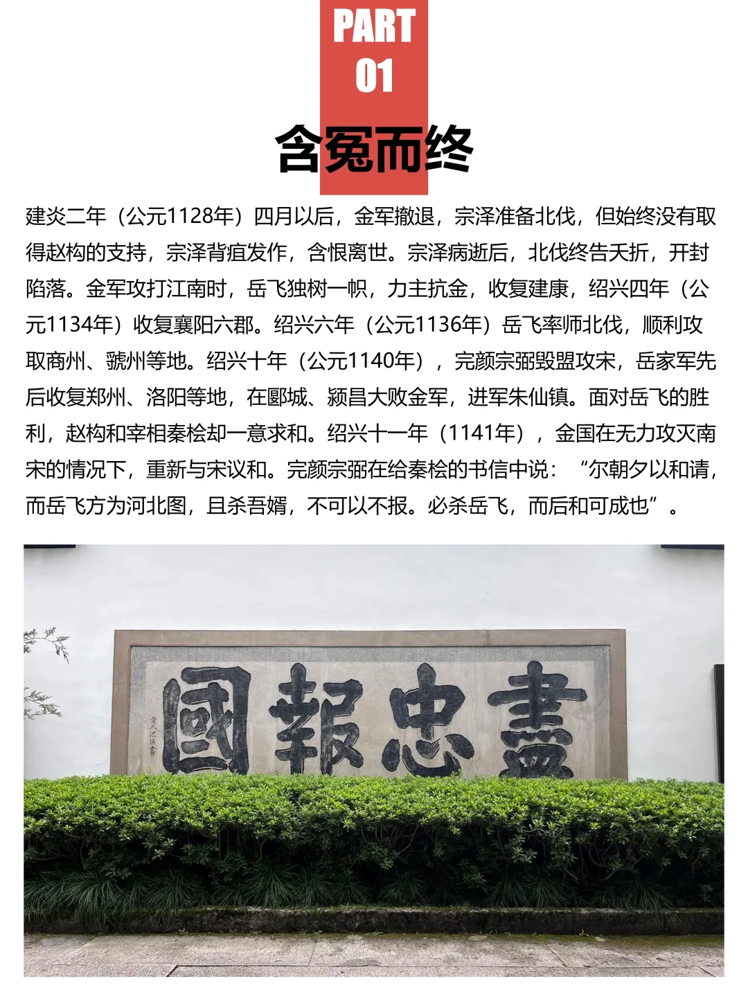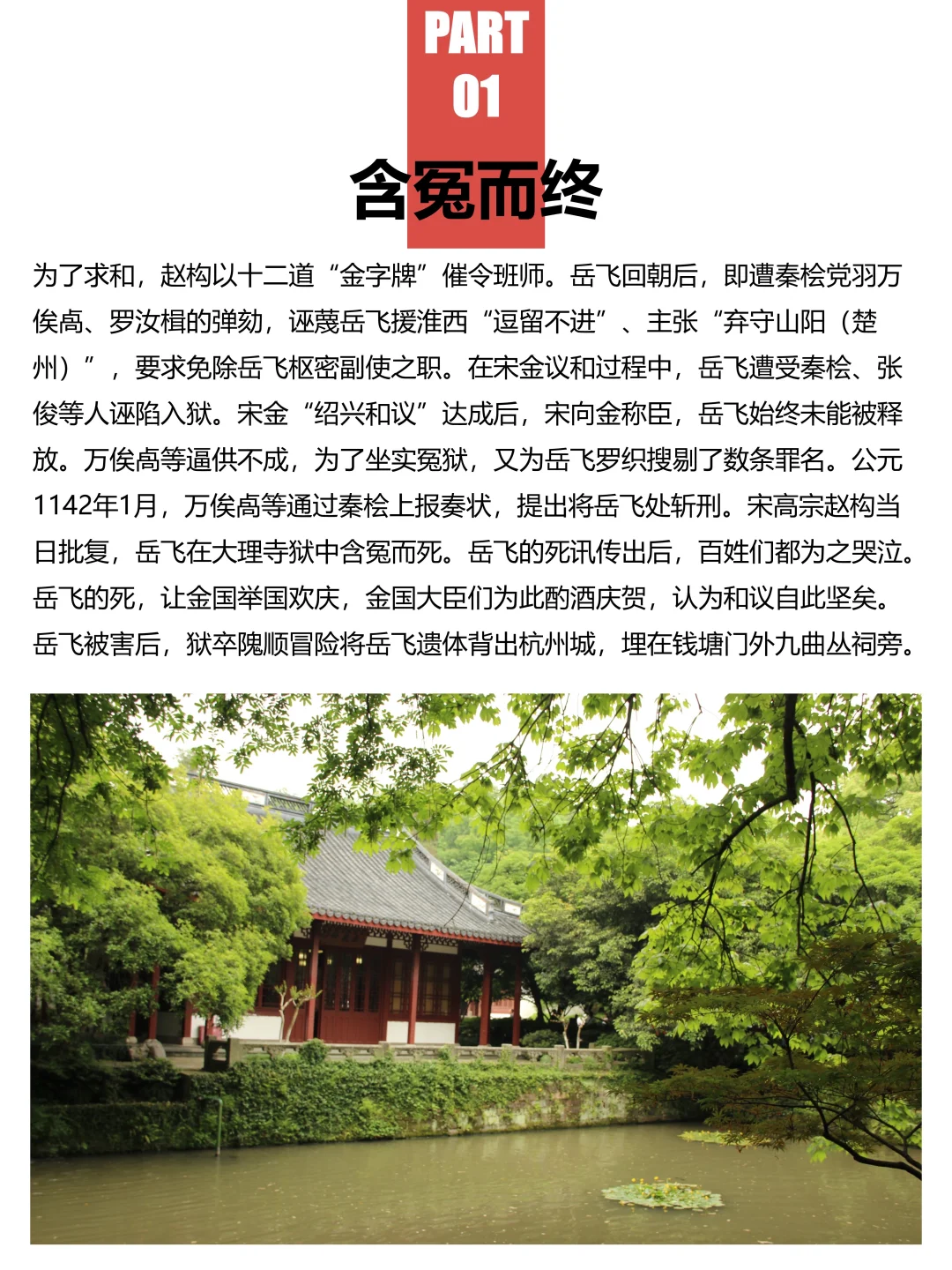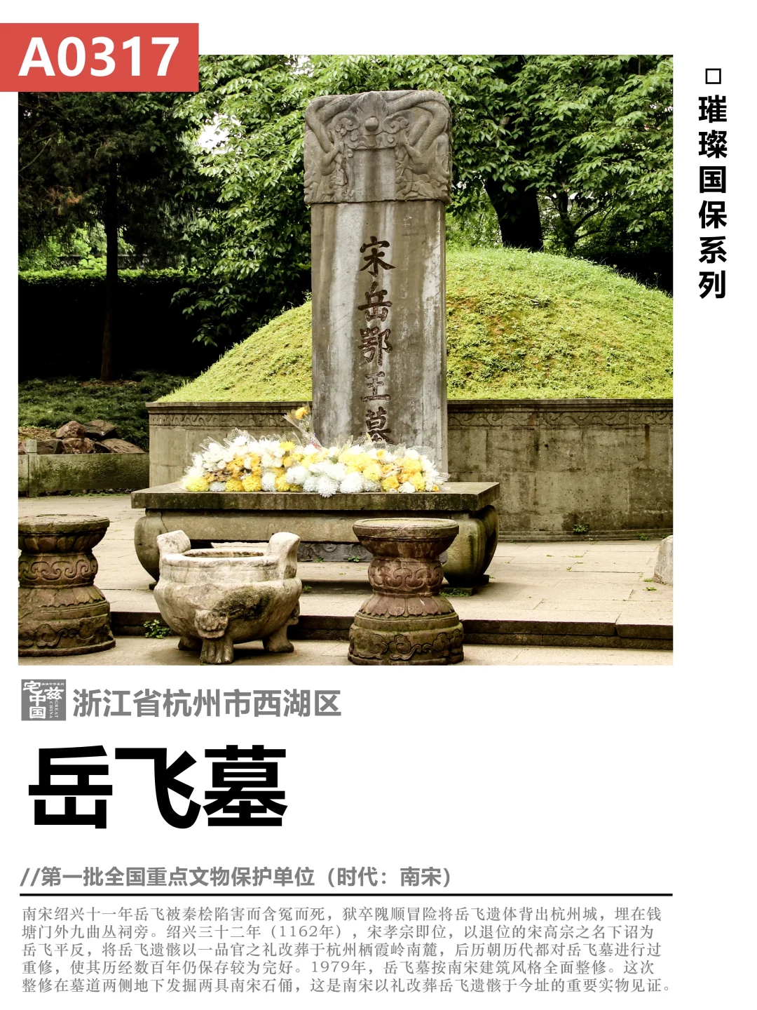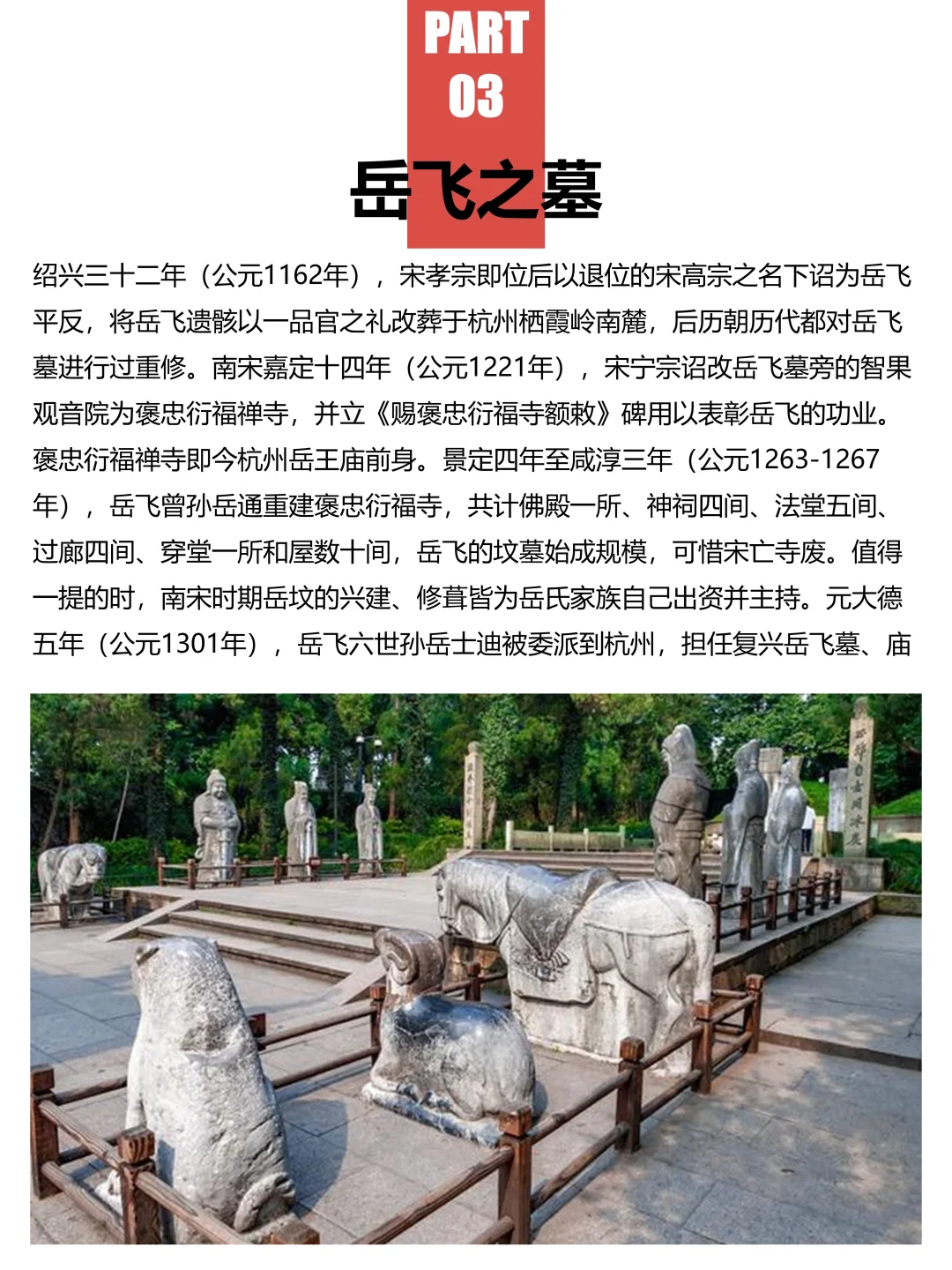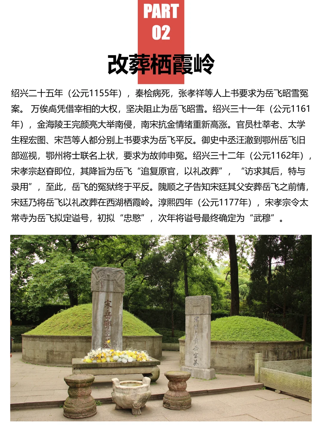 南宋绍兴十一年岳飞被秦桧陷害而含冤而死,狱卒隗顺冒险将岳飞遗体背出杭州城,埋在钱塘门外九曲丛祠旁。绍兴三十二年(1162年),宋孝宗即位,以退位的宋高宗之名下诏为岳飞平反,将岳飞遗骸以一品官之礼改葬于杭州栖霞岭南麓,后历朝历代都对岳飞墓进行过重修,使其历经数百年仍保存较为完好。1979年,岳飞墓按南宋建筑风格全面整修。这次整修在墓道两侧地下发掘两具南宋石俑,这是南宋以礼改葬岳飞遗骸于今址的重要实物见证。