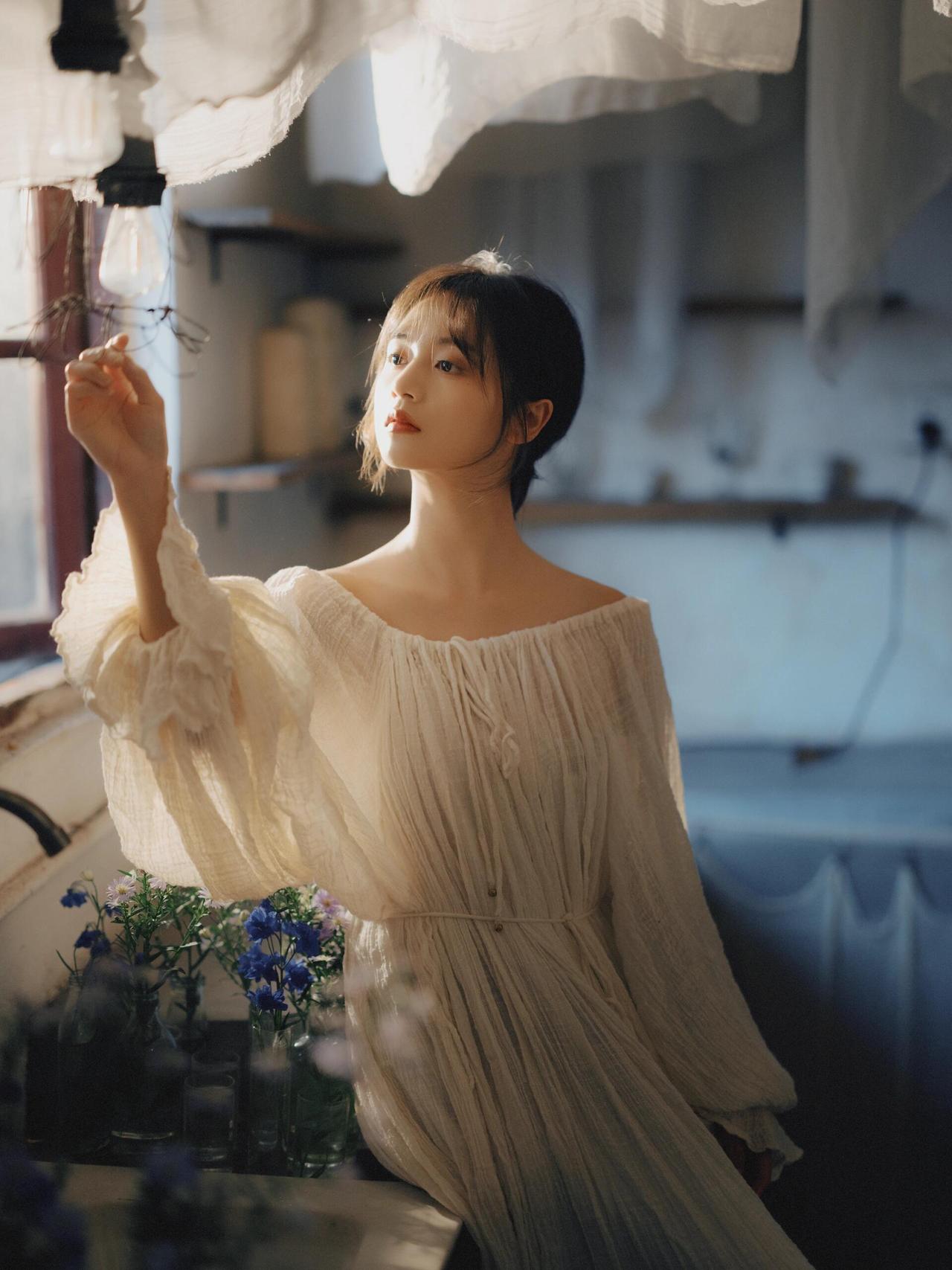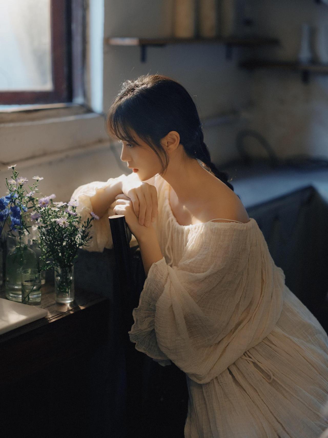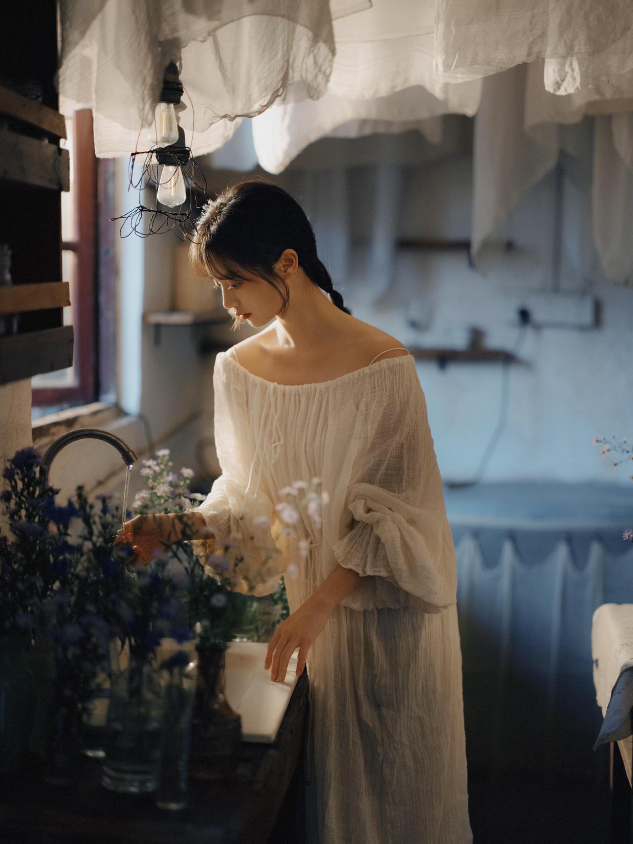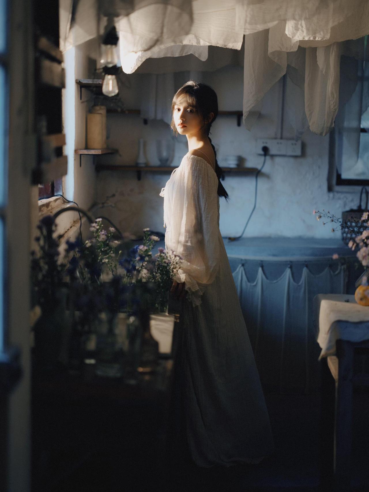 冷调并非冰冷,而是通过低饱和的色彩、柔和的光影,营造出一种静谧、怀旧的情绪基底,让观者在画面中感受到时光的沉淀与生活的诗意。 场景的选择极具巧思,老旧的房间、复古的陈设,本身就承载着大量的岁月记忆,为画面的诗意叙事提供了丰富的素材。人物的穿搭与场景风格高度统一,米白色褶皱裙的复古感与场景的旧时光质感相得益彰,宽松的版型更凸显出人物在这方小天地里的松弛与自在。 光影的运用是画面的点睛之笔,柔和的侧光勾勒出人物的轮廓与服饰的纹理,让冷调的画面有了温暖的层次变化。人物的动作与神态自然且富有情绪,手持花束的温柔、轻触灯线的好奇、打理花束的专注,每一个瞬间都如同一帧帧生活的切片,在冷调的氛围里,传递出诗意栖居的美好愿景。