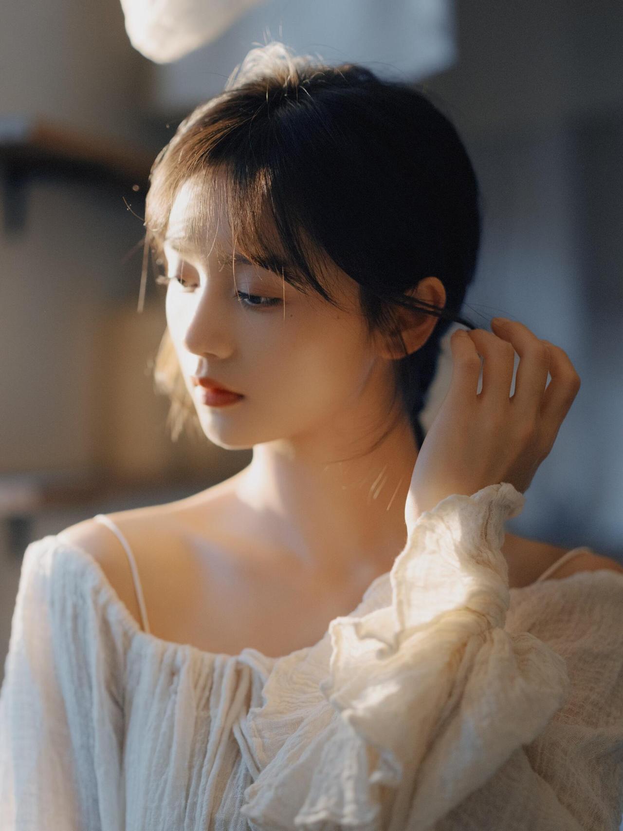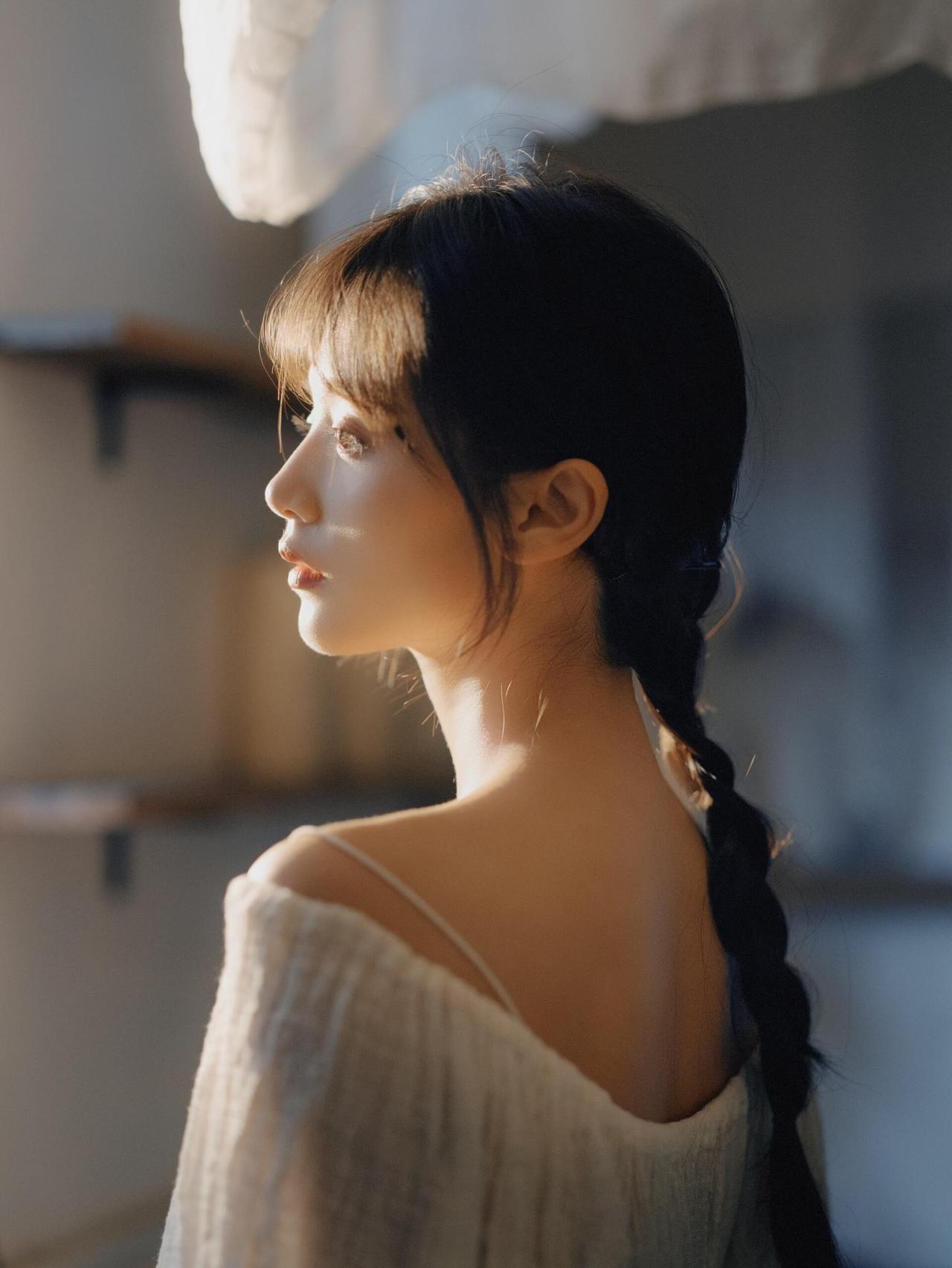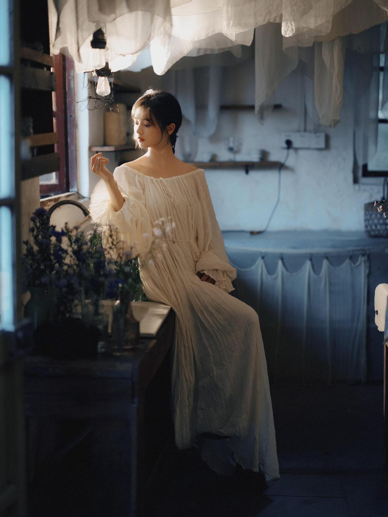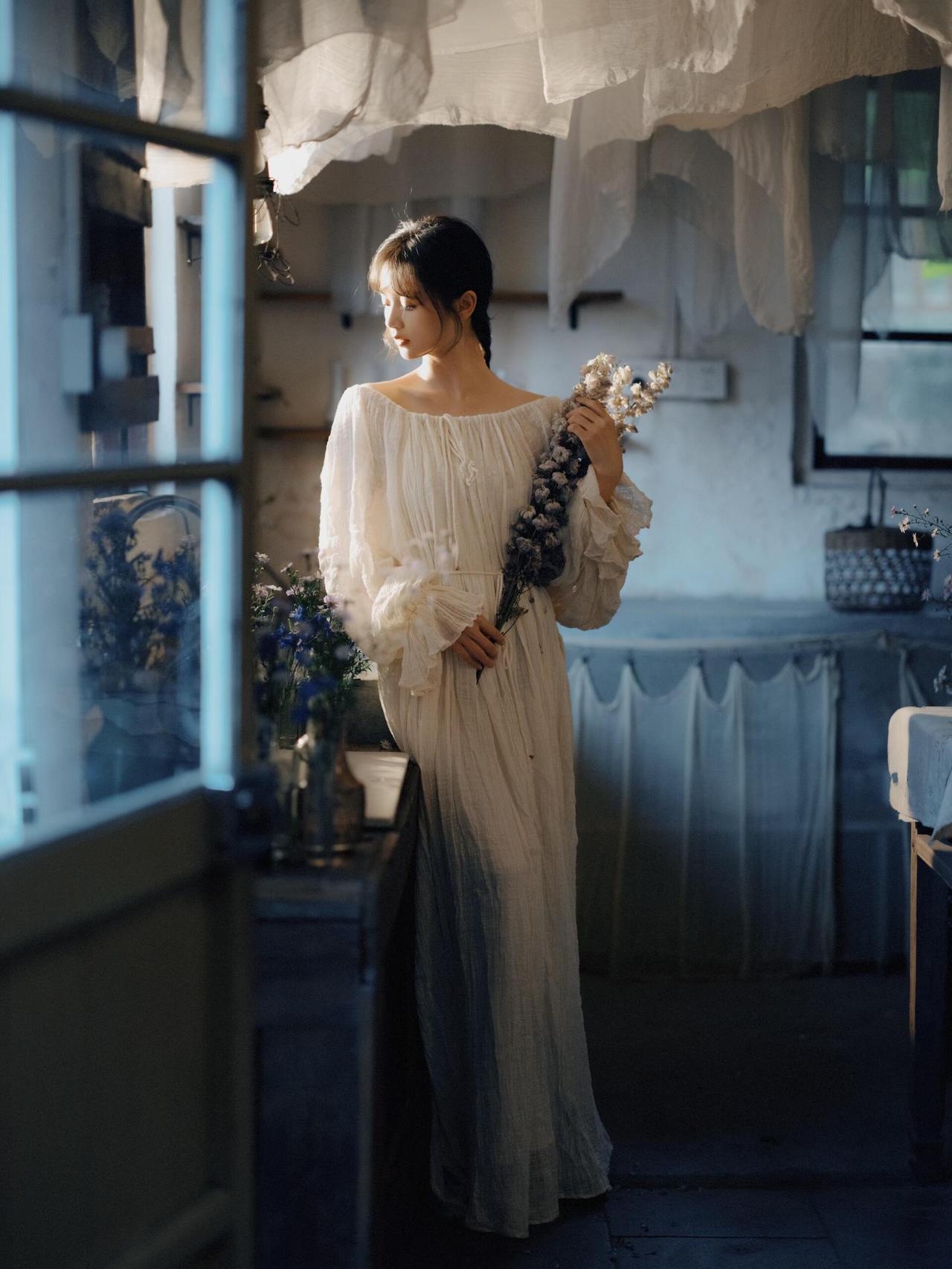 冷调并非冰冷,而是通过低饱和的色彩、柔和的光影,营造出一种静谧、怀旧的情绪基底,让观者在画面中感受到时光的沉淀与生活的诗意。 场景的选择极具巧思,老旧的房间、复古的陈设,本身就承载着大量的岁月记忆,为画面的诗意叙事提供了丰富的素材。人物的穿搭与场景风格高度统一,米白色褶皱裙的复古感与场景的旧时光质感相得益彰,宽松的版型更凸显出人物在这方小天地里的松弛与自在。 光影的运用是画面的点睛之笔,柔和的侧光勾勒出人物的轮廓与服饰的纹理,让冷调的画面有了温暖的层次变化。人物的动作与神态自然且富有情绪,手持花束的温柔、轻触灯线的好奇、打理花束的专注,每一个瞬间都如同一帧帧生活的切片,在冷调的氛围里,传递出诗意栖居的美好愿景。