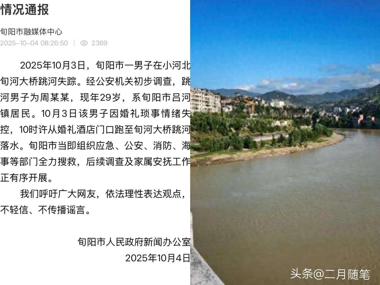 结婚当天跳河男子遗体已找到,女方称会尽快去看; 男方家属:在大桥下游上百米处发现遗体! 婚礼当天他跳河身亡, 真相被“彩礼”淹没, 谁还记得他只是个普通人—— 2025年10月3日, 陕西旬阳, 29岁新郎周某某在婚礼当天跳河失踪, 引发全网热议! 网上疯传因新娘加彩礼、 家庭矛盾等导致悲剧, 甚至编出“母亲也跳江”的谣言! 官方迅速辟谣并处罚造谣者, 但舆论依旧汹涌! 他或许只是一时情绪崩溃, 却被贴上“彩礼受害者”标签! 没人关心他为何崩溃, 只顾着站队、转发! 他跳下的那一刻, 没人拉他; 他走后, 故事全由他人编写! 别让情绪代替真相, 别让标签淹没一个普通人的人生! 你怎么看? 婚礼小伙跳河 婚礼跳河