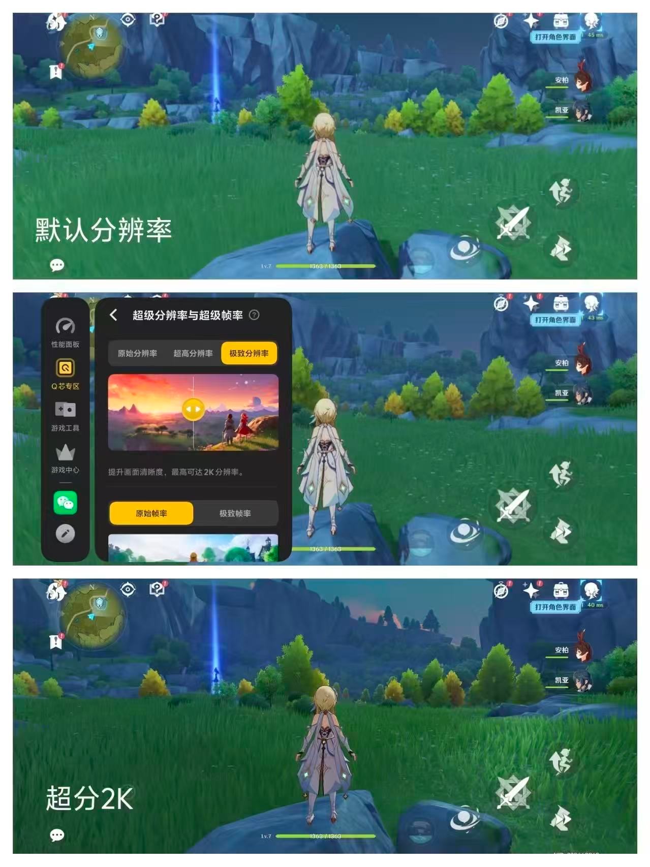 基于首发的QNSS超级渲染引擎,带来了更精细的画面渲染能力。游戏开启2K超分后,画面观感确实清晰细腻,植物的轮廓和人物细节比原生的好太多了,这个体验感知提升真的是很明显,完全就是PC级的画质体验,而且这个超分后的2K画面是可以真实截图出来的,这下清晰好看的游戏画面可以随心分享了。
