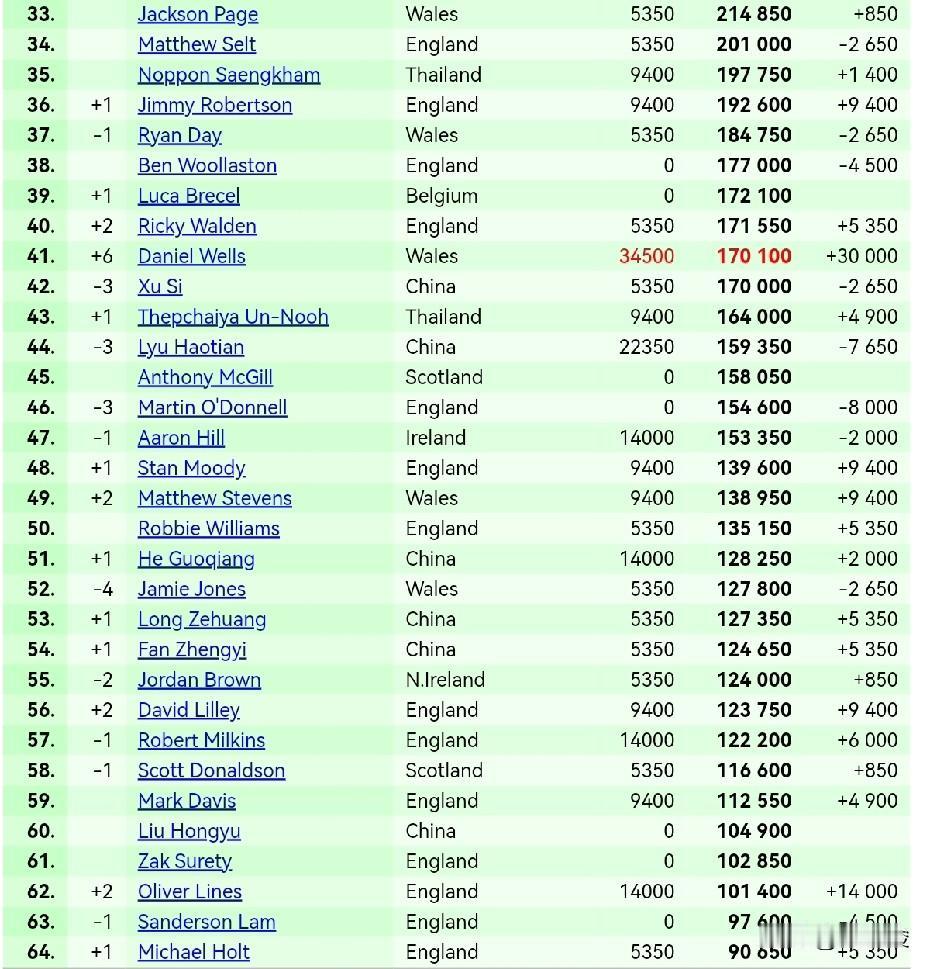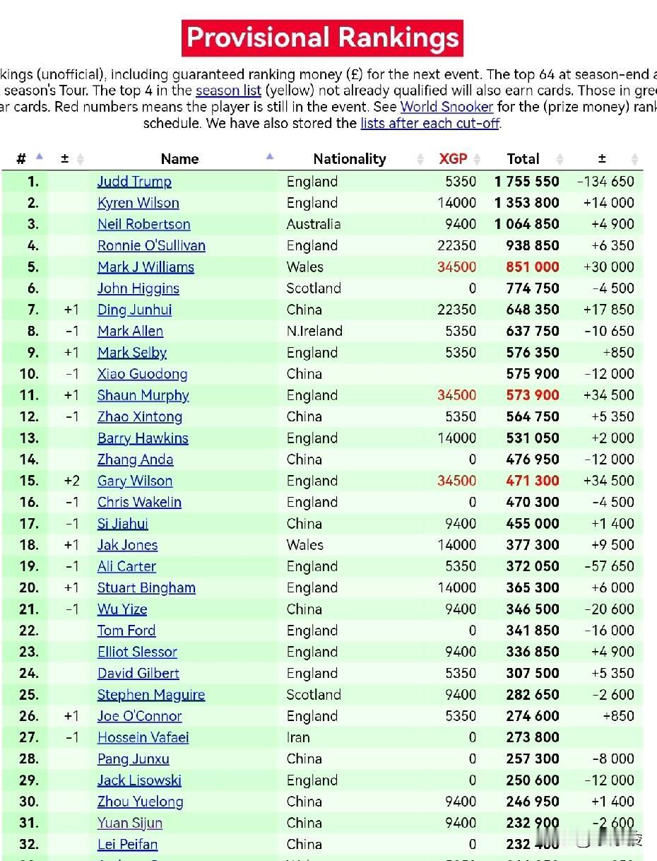 斯佳辉临时排名跌出前16。加里·威尔逊进西安大奖赛4强,临时排名升至第15,斯佳辉被挤出前16,排第17。 丁俊晖进了8强,拿到2.235万英镑奖金,排名升至第7,肖国栋降至第10,墨菲升至第11,赵心童降到第12,张安达第14。加里·威尔逊升2位,排第15,韦克林降1位,排第16,斯佳辉第17。 吕昊天虽然进了西安大奖赛8强,但因为要扣之前的积分,排名不升反降,排第44。
