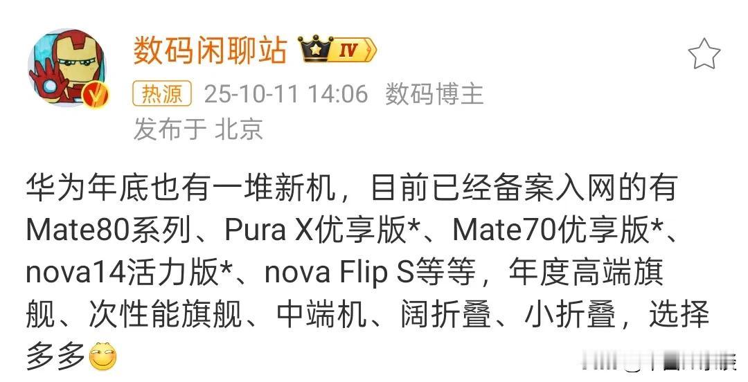 华为年底也有一堆新机!金九银十的销售旺季,也是各手机厂家全力冲刺的时间段。华为备案入网的新品不少。Mate80系列、Pura X优享版、Mate70优享版、nova14活力版、nova Flip S,涵盖中高端各种品类。对华为品牌情有独钟的不妨等等。