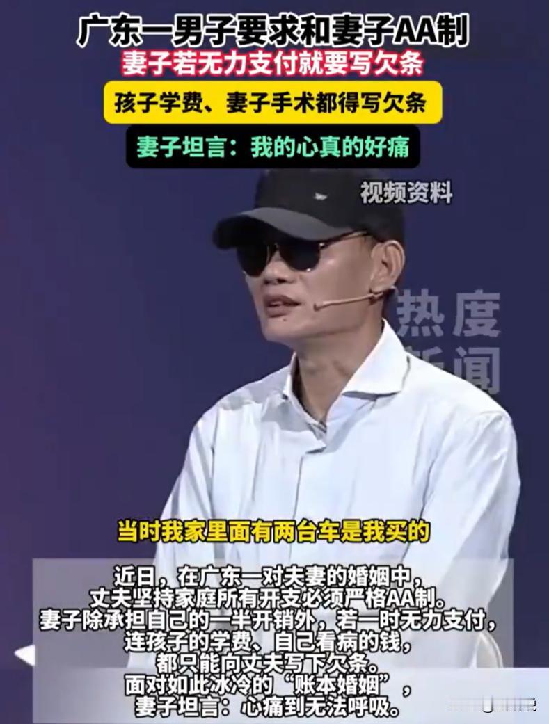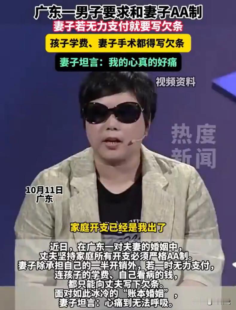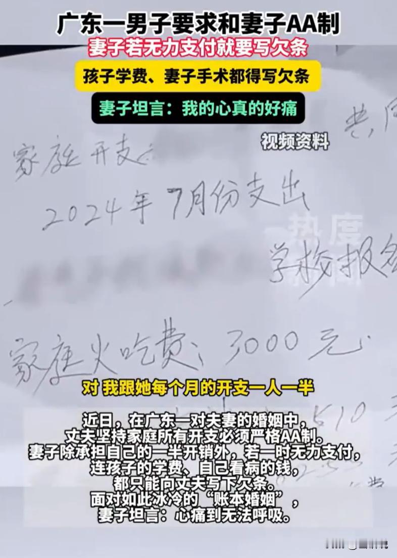 “这结婚的意义是什么?”广东,一对夫妻结婚后,丈夫坚持过财产AA制的生活,如果只是吃饭聚餐也就罢了,就连子女学费、自身做手术都要打欠条,这样的生活,终于让妻子忍无可忍了。网友:这是拼婚吗? 妻子坦言,在两人的婚姻生活中,丈夫家庭的所有开支必须严格AA制,你的就是你的,我的就是我的,而且是没有任何商量的余地 妻子除了要承担自己一半的开销,如果一时无力支付,就算是孩子交学费,自己看病的钱,也需要和丈夫写欠条,可以说是事无巨细,每次一想到这些,都感觉很心痛 看到这里,很多网友忍不住发问:那饭是谁做的?家里卫生是谁打扫的?如果真要算得这么清楚,做饭要不要收加工费?打扫卫生要不要算工时费?这样的婚姻,跟合伙开公司有什么区别? 其实,婚姻中的经济独立本没有错。许多现代夫妻也会选择各自管理收入,共同承担家庭开支。但这种模式的背后,应该是彼此的信任和体谅 婚姻不是简单的1+1,而是两个人决定在人生路上彼此支撑,共同面对风雨。如果一方遇到困难,另一方首先想到的是立字据、算明账,那么这段关系早已背离了婚姻的初衷