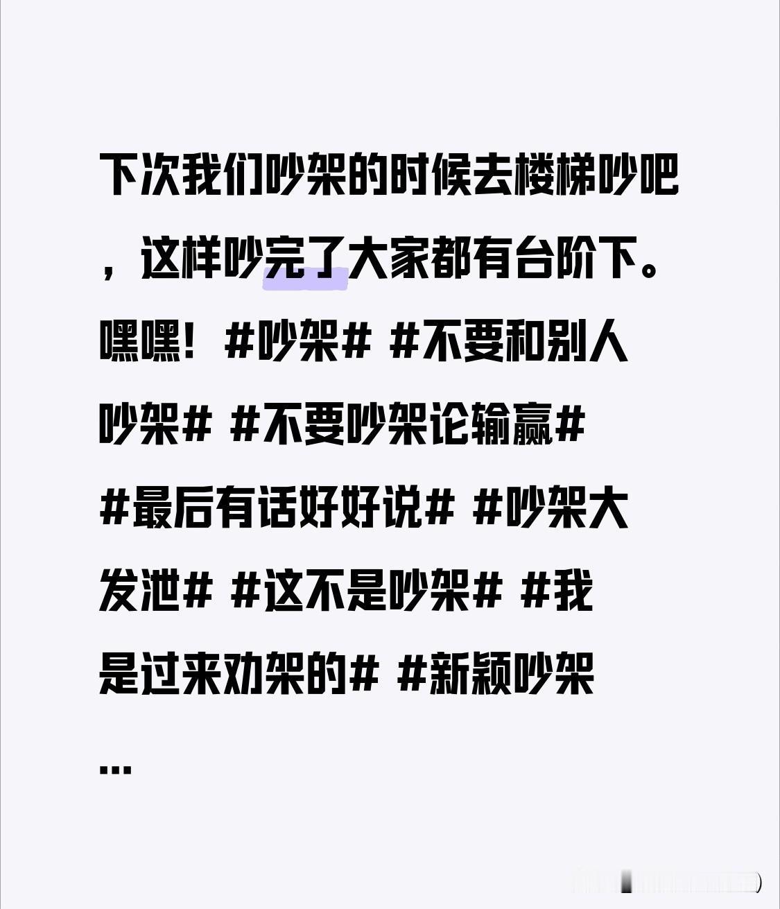 下次我们吵架的时候去楼梯吵吧,这样吵完了大家都有台阶下。 嘿嘿! 吵架 不要和别人吵架 不要吵架论输赢 最后有话好好说 吵架大发泄 这不是吵架 我是过来劝架的