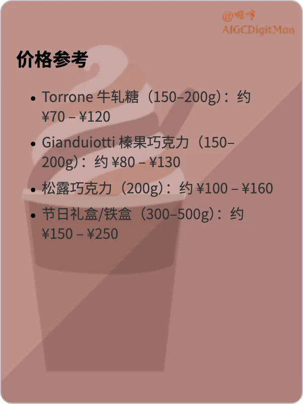 Torrone 牛轧糖(150–200g):约 ¥70 – ¥120