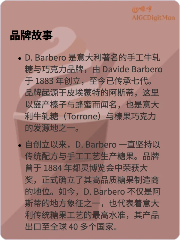 如今,D. Barbero 不仅是阿斯蒂的地方象征之一,也代表着意大利传统糖果工艺的最高水准,其产品出口至全球 40 多个国家。