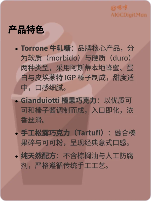 Torrone 牛轧糖:品牌核心产品,分为软质(morbido)与硬质(duro)两种类型,采用阿斯蒂本地蜂蜜、蛋白与皮埃蒙特 IGP 榛子制成,甜度适中,口感细腻。