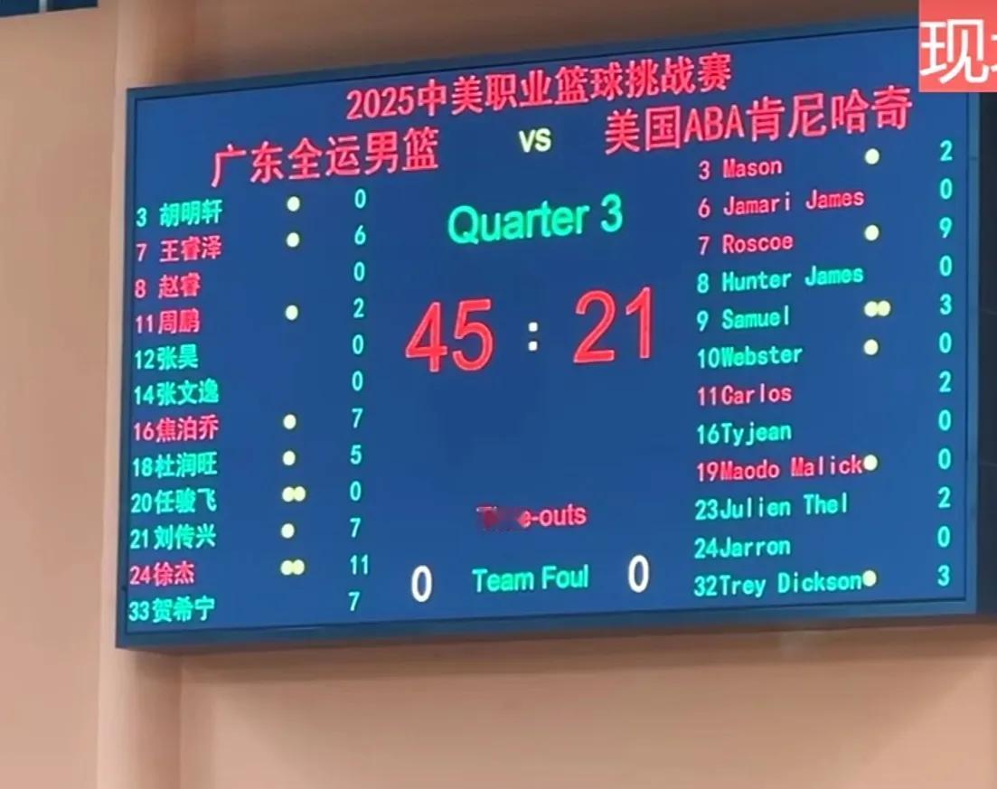 广东全运队71-63战胜肯尼哈奇队,上半场顺风顺水的45-21领先24分,球迷以