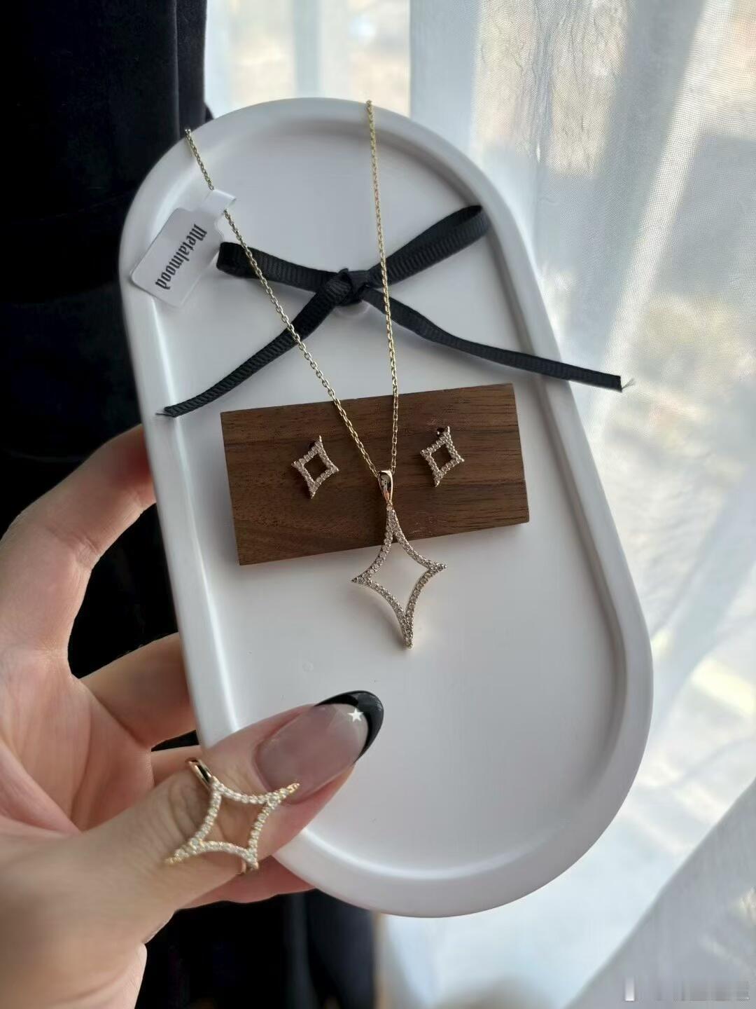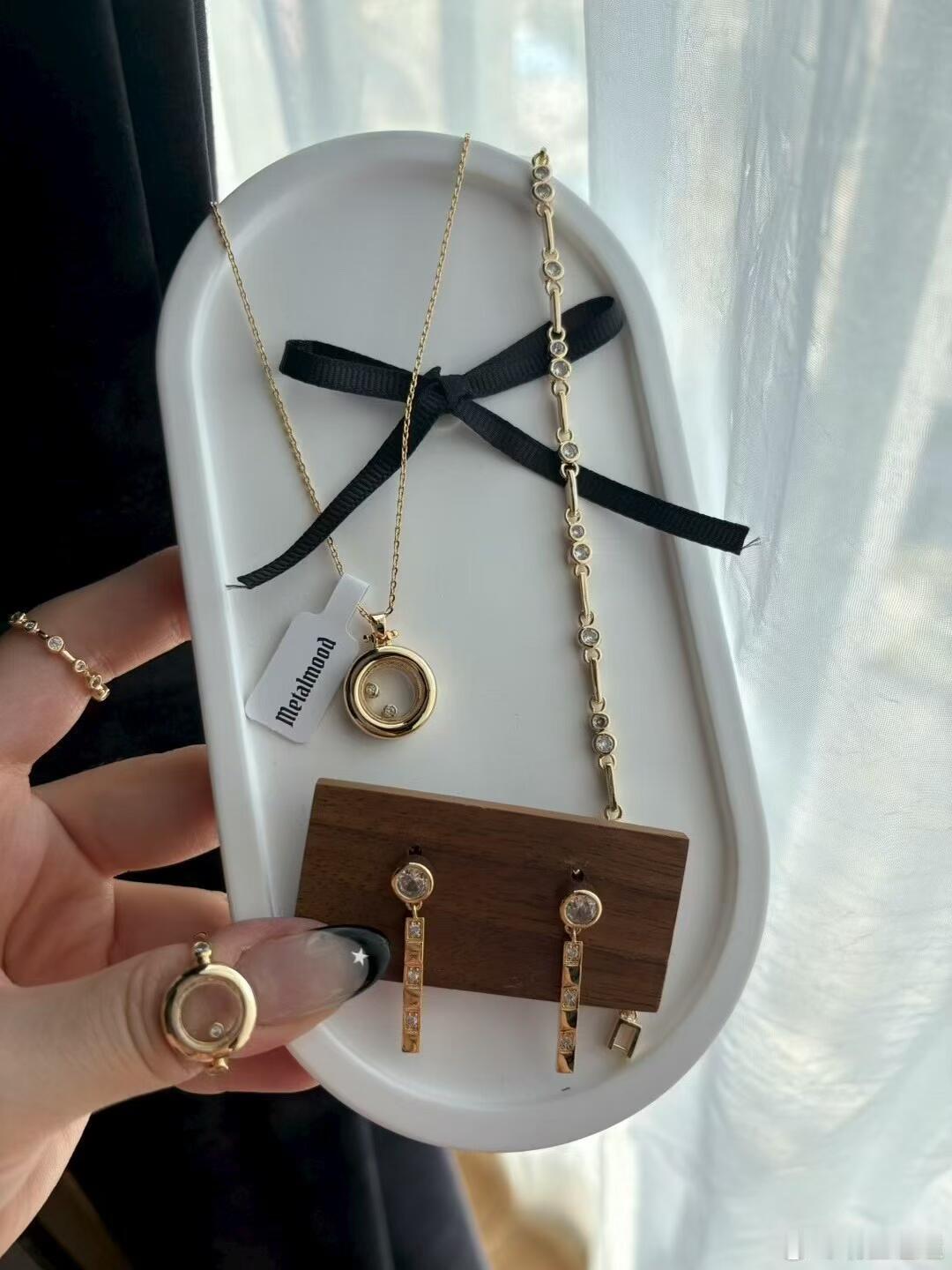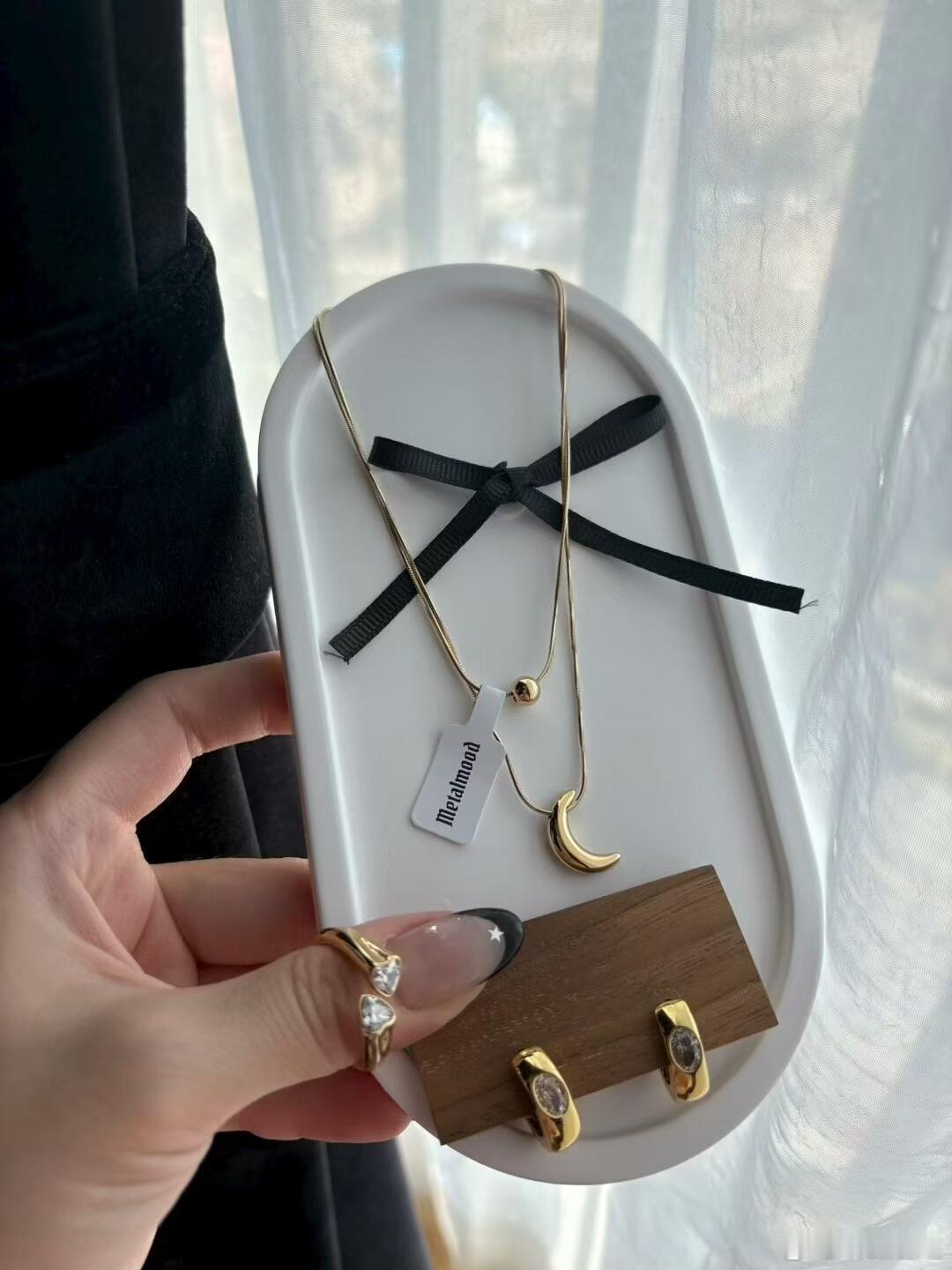 它们被精心陈列于白色椭圆瓷盘中,背景是浅色大理石纹理,凸显高级质感。一只佩戴着黑色法式美甲和两枚金色戒指的手轻扶瓷盘,为画面注入动态的生活气息,也展示了叠戴的时尚可能。整体配色以金、白、黑为主,简约时尚。新月与蝴蝶结元素浪漫别致,整套饰品完美平衡了精致感与日常实穿性,无论是单独佩戴还是组合叠搭,都能轻松提升造型的细节品味。时尚配饰
