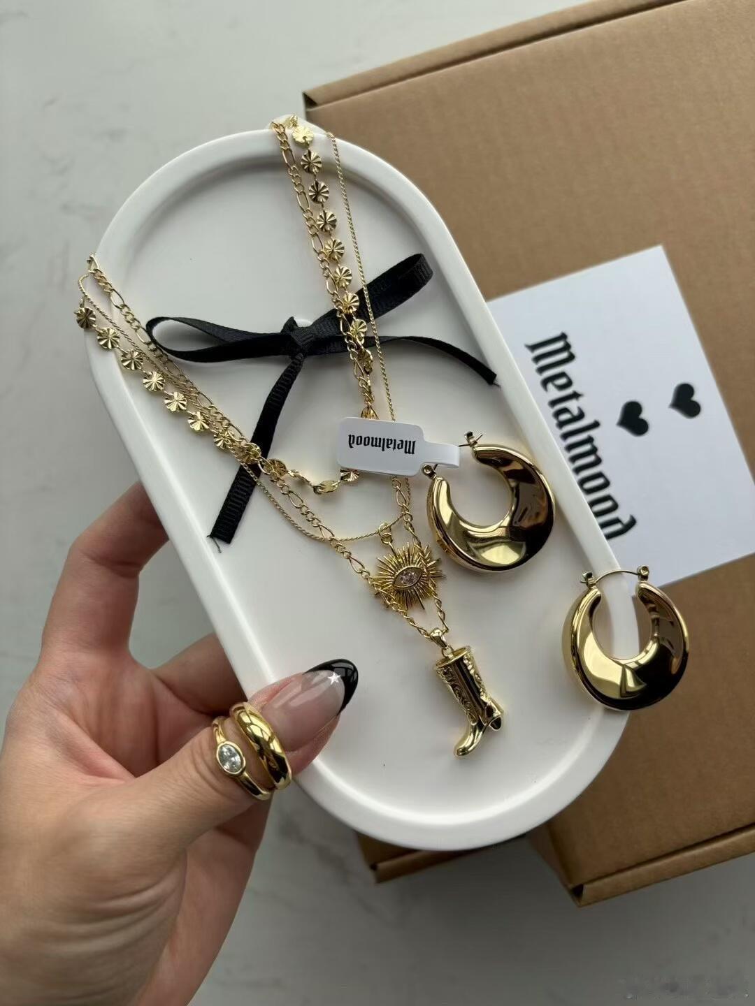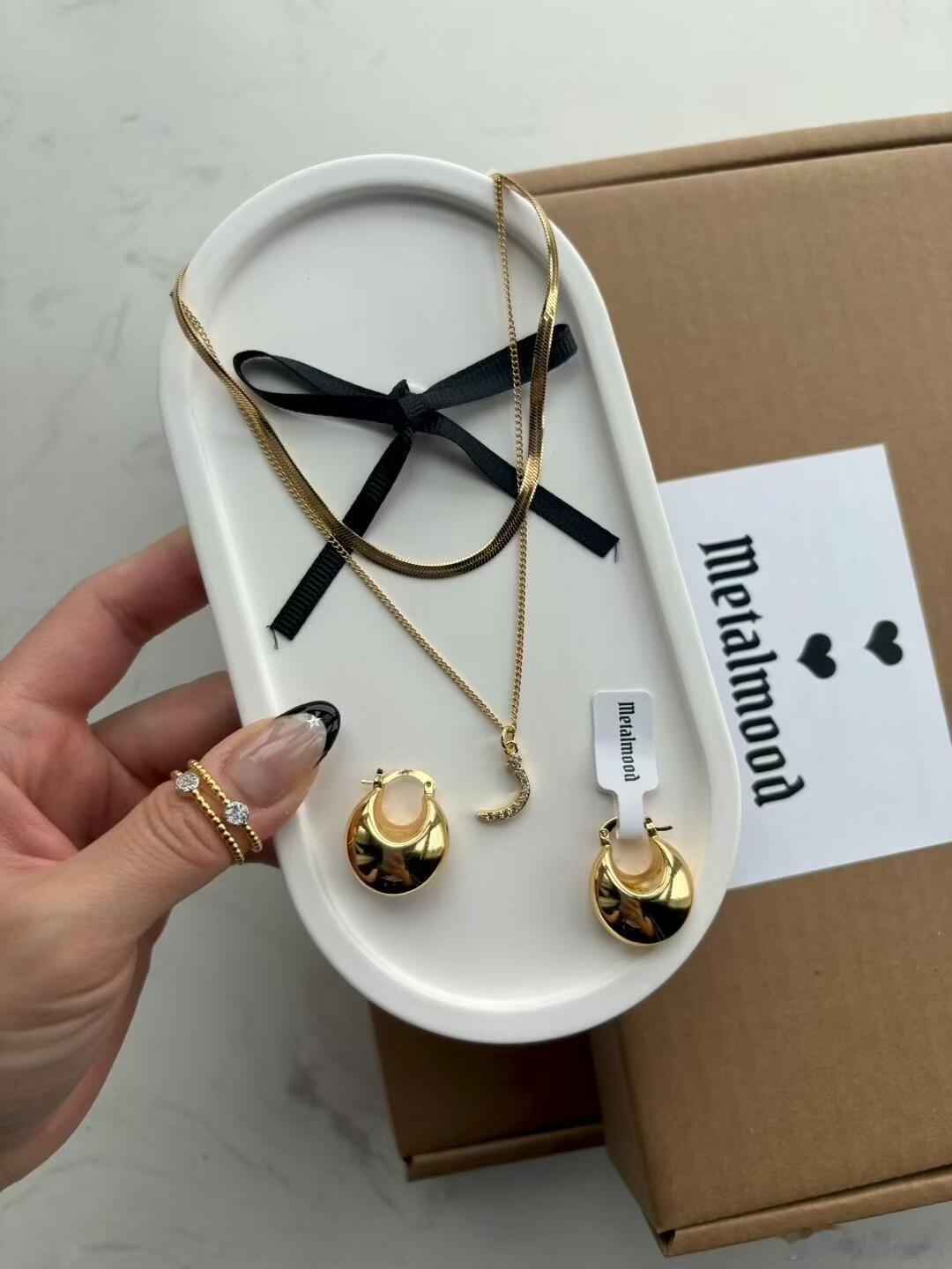 这组饰品来自品牌“metalmood”,以极简设计诠释现代优雅。套装包含一条纤细蛇骨链与黑色蝴蝶结搭配的短项链、一枚镶嵌闪钻的精致新月吊坠长项链,以及一对线条流畅的金色C形耳环。饰品均呈现耀眼的金色光泽,质感十足。