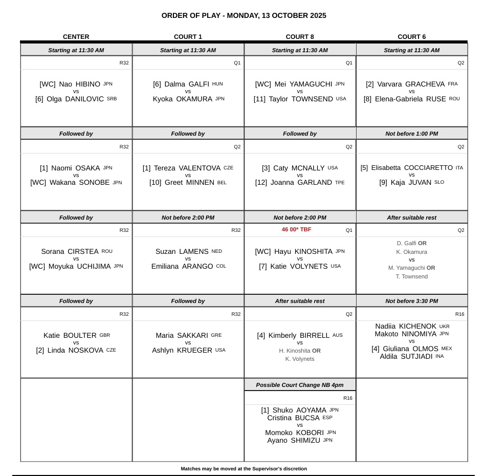 大坂直美出战首轮,诺斯科娃对决博尔特,萨卡里迎战克鲁格。