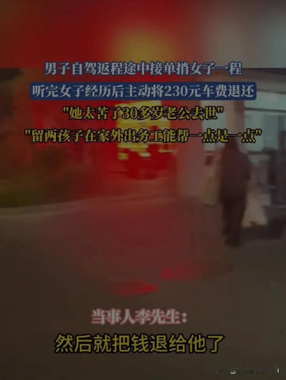 暖心!河南民权,男子自驾返程,顺路捎了位女子。对方付230元,突然,他把车费退还给女子。只因女子的丈夫去世了,把两个孩子留家里,女子一个人外出打工赚钱,他觉得太苦了,真的是不容易。 国庆收假那天,李先生把老母亲塞的腌菜和鸡蛋往后备箱一放,就准备发动车子回慈溪。 这是他在那边电子厂上班的第八个年头,车间里的流水线每天转十几个小时,他的手上还留着去年赶工蹭出的茧子,每年也就国庆和春节能回两次家。 出发前刷本地拼车消息时,他看到条搭车信息,是个30多岁的女子要去商丘火车站转车,目的地正好和他顺路。 他很快给对方发了消息,约定好在村口等。赶到时,女子正拎着个鼓鼓的布包站在路边,头发随意扎着,衣服洗得有些发白。“麻烦您了师傅。” 女子上车时特别客气,坐稳后立刻掏出手机转了230块钱,说这是之前问过的拼车价,生怕给少了。李先生没多想,随口应了声,发动车子上了路。 刚上高速没多远,女子的手机响了,屏幕上跳着“大宝”两个字。她接起电话的瞬间,声音立马软了下来,可没说两句,眼圈就红了,连带着声音也开始哽咽。“妈妈你啥时候回来?弟弟哭着要找你……” 电话那头传来孩子的哭声,女子捂着嘴沉默了好一会儿,才低声哄道:“乖,妈妈赚了钱就给你们买文具,再等等好不好。” 挂了电话,车里安静得有些压抑。 李先生从后视镜看了眼,女子正用手背擦眼睛,布包拉链没拉严,露出半截孩子的作业本。“妹子,孩子还小吧?”他忍不住开口。这话像打开了话匣子,女子叹了口气,慢慢说起自己的情况。 丈夫去年出意外走了,家里两个娃,大的13岁上初中,小的才5岁,全靠老家婆婆带着。她一个人出来打工,在浙江找了份电子厂的临时工,一个月四千多块,房租水电扣完,剩下的全寄回家,连件新衣服都舍不得买。 李先生握着方向盘的手顿了顿。他太懂这种滋味了。自己在慈溪的工厂里,每天加班到深夜,就为了多赚点绩效奖,每次视频看到儿子扒着屏幕喊爸爸,心里都发酸。 女子一个女人家,要扛着全家的担子,这230块说不定是她好几天的伙食费,是孩子一周的早餐钱。想到这儿,他没犹豫,直接点开转账页面,把230块退了回去。 女子愣了半天,盯着退款通知反应不过来,连忙要重新转钱:“师傅,这可不行,您跑这么远路,油钱都不够。”李先生摆了摆手,语气很实在:“你不容易,这钱我不能收。 我顺道的事,不差这点,你留着给娃买点吃的。”女子还想推辞,可看着李先生坚决的眼神,最终没再坚持,只是反复说着谢谢,眼泪掉在了布包上。 快到火车站时,女子从布包里掏出个塑料袋,硬塞给李先生,里面是晒干的红薯干。“这是俺妈自己晒的,娃爱吃,您尝尝。”李先生推辞不过收下了,看着女子拎着布包匆匆进站的背影,心里说不出的滋味。 后来妻子问起这事,李先生轻描淡写说了经过,妻子笑着骂他“傻人有傻福”,说他做得对。同村人知道后,也没人说他亏了,反倒都夸他实在。他没觉得自己做了多了不起的事,只是想起女子说“娃等着钱交学费”时的样子,就觉得那点钱不算什么。 不是所有善意都要轰轰烈烈。 230块对很多人来说或许不多,可对独自撑起一个家的女子来说,是实实在在的温暖。李先生的举动,藏着最朴素的共情——因为自己淋过背井离乡的雨,所以见不得别人在风雨里独行。这种不带功利的善意,恰恰是最动人的力量。 各位读者你们怎么看?欢迎在评论区讨论。