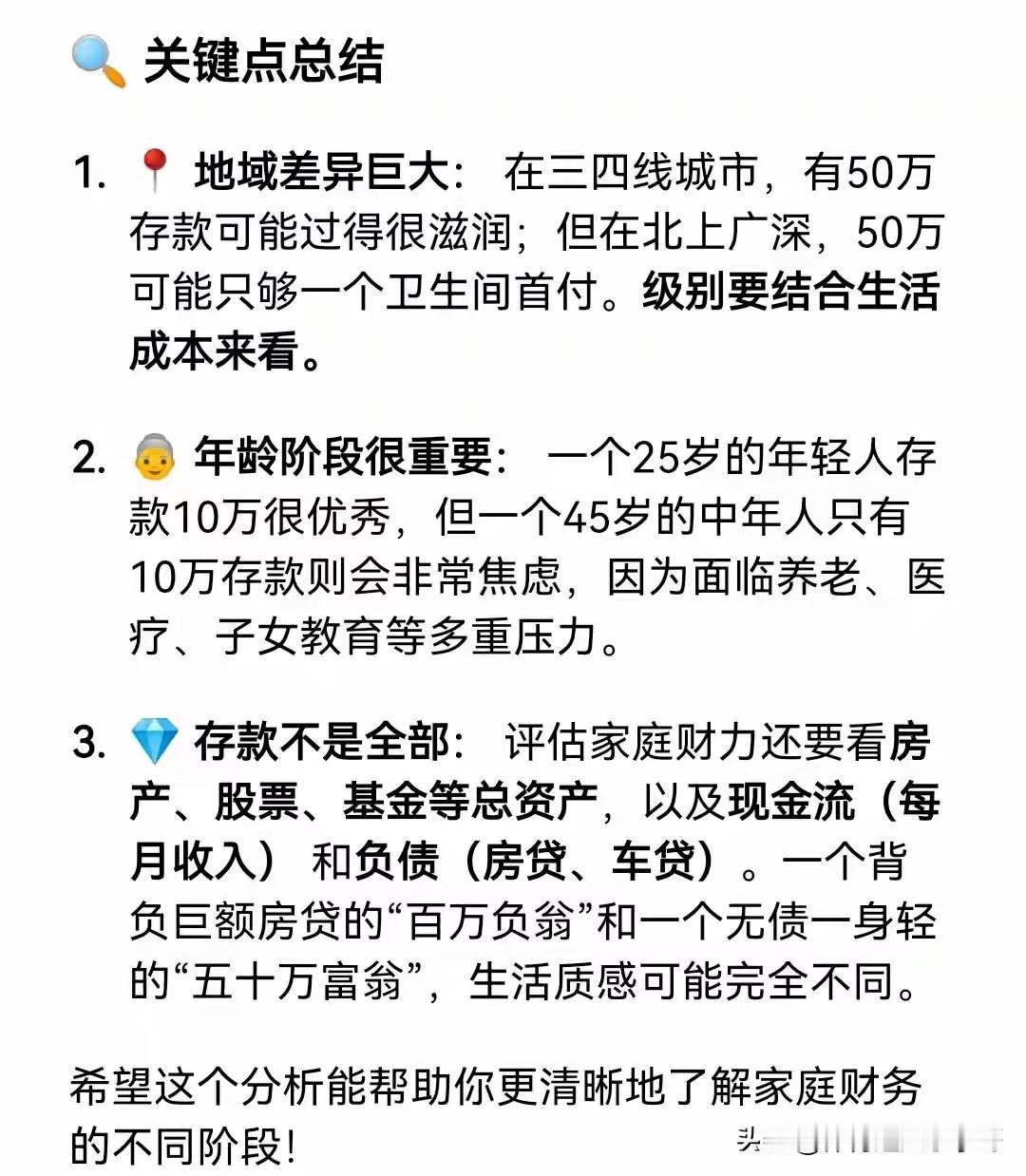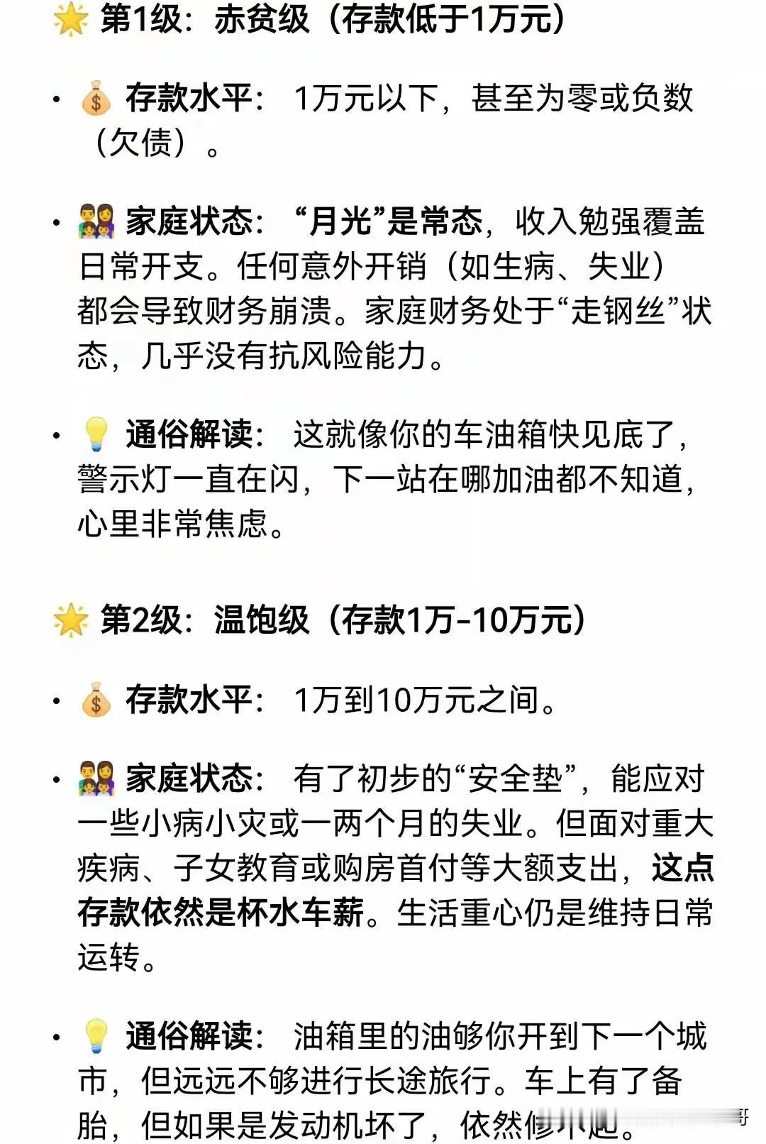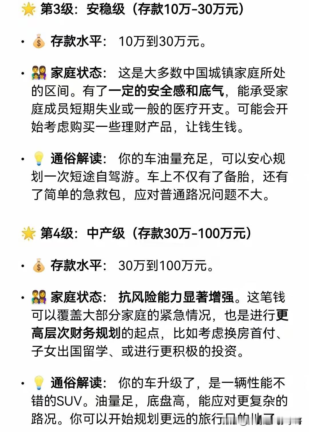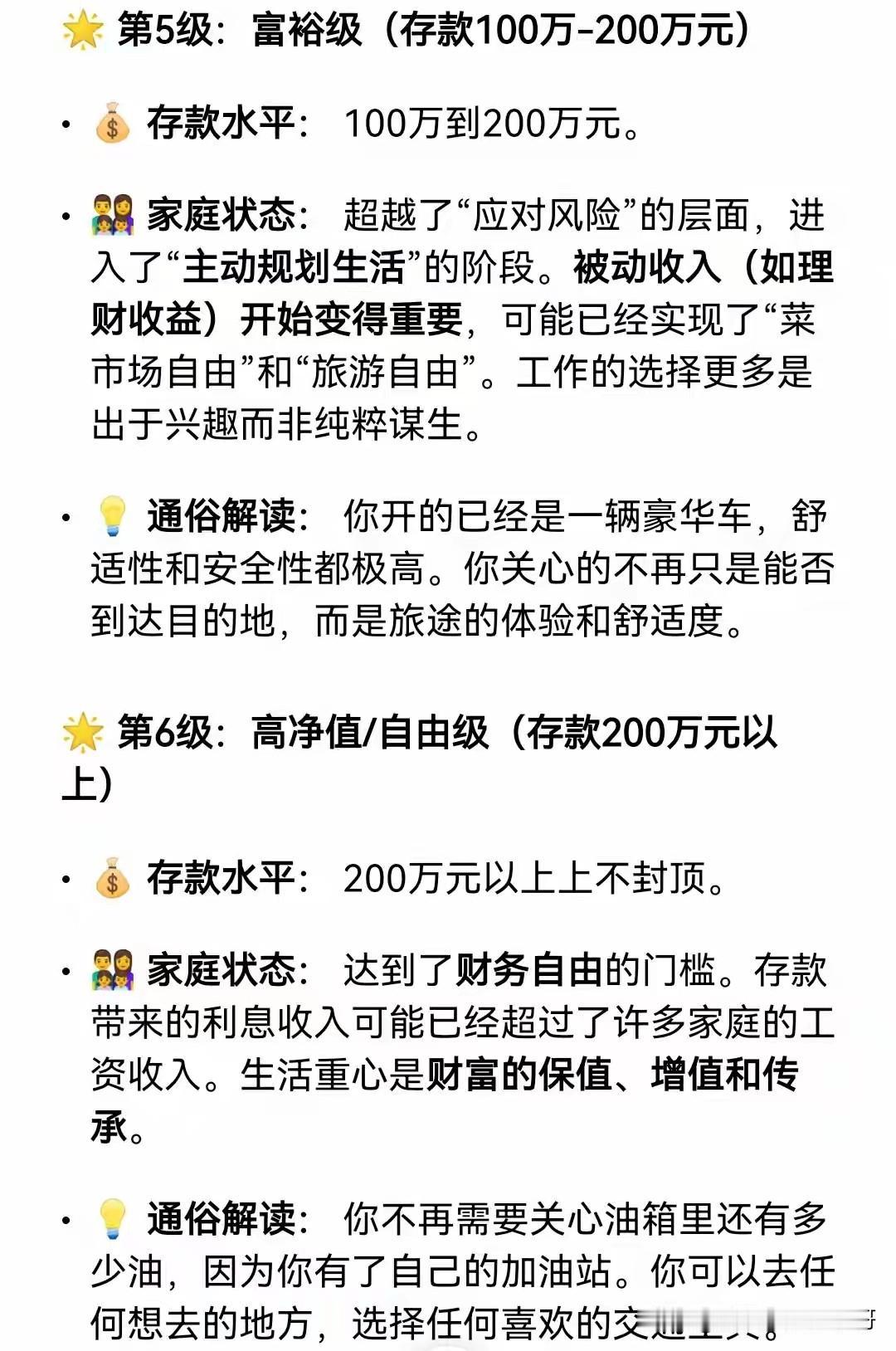 一个二十五岁的小伙子,如果大学或者研究生刚毕业就存款了10万,那他很优秀,因为他在同龄人当中已经是非常突出的,很多人甚至还欠学校在学校贷款,如果是一个45岁,5岁的男人,连10万存款都没有的话,他都会很焦虑,因为他上有老下有小,中间还有老婆,中间家里处处都需要花钱,所以说他非常焦虑,这是为什么很多中年人喜欢喝酒的原因,因为压力太大呀,其他方式又发泄不出去,有的又不爱运动,有的又不爱唱歌,只能通过喝酒划拳来发泄自己内心的郁闷,我刚才看一看存钱的标准,这存款1万只过了温饱线,存款10万稍微稳定一点,100000~300000的比较有安全期,300000~100万,那处于比较满足,100万以上的话就属于较为富裕了,200万以上的话是非常富裕了,500万以上是巨富了。当然要看是在什么城市,如果是在三四线城市的话,可能50万就过得很好了,因为那边儿的吃喝拉撒都比较便宜,如果是在一线城市的话,可能连一个洗手间都买不了。我记得胡润排行榜还说呃3000万是很多城市的一个财富自由的一个标准,尤其是二三线城市,但是如果在一线城市想达到财富自由的话,还得需要7000万,看来我们路还很长啊,还需要努力的范围很广!