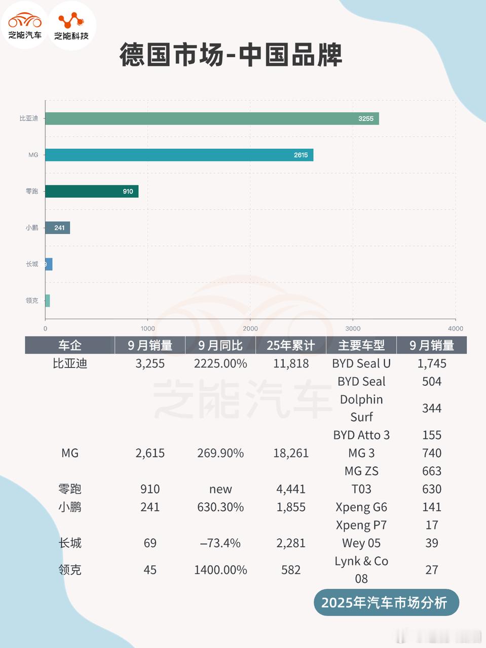 中国品牌合计份额虽不高,但增长势头强劲:比亚迪销量暴增且首次跻身品牌排行前二十,名爵保持强劲增长,零跑首次大规模进入德国市场,各主要中国品牌均实现显著增长。