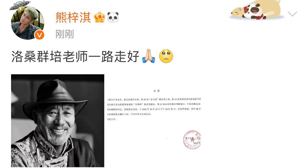 熊梓淇发文悼念洛桑群培洛桑群培病逝 10月13日,发布讣告,知名表演艺术家洛桑群培于10日在拉萨病逝,享年68岁。
