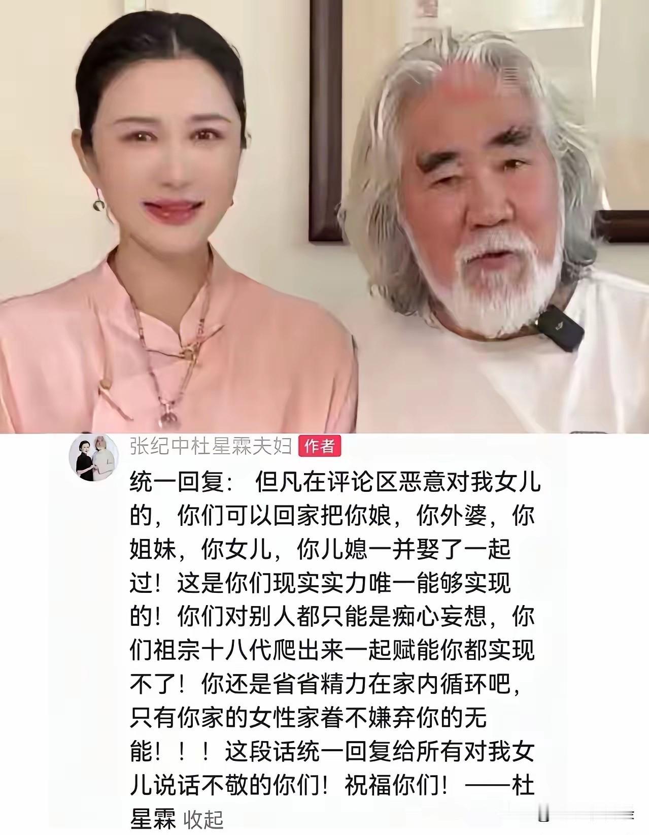 这是网友说了啥了,两口子就这么大放厥词,一点涵养和素质都没有,败光了好感,只有厌恶和不屑,这么大岁数了,真让人瞧不起。 本来就是老少配,还在网上高调秀恩爱,不是晒老公就是晒媳妇,再就是晒娃,晒娃,晒娃…也不知道他俩生了几个娃了。 既然能把家里的事儿整天放在网上晒,就别怕黑,晒了这么多年早就晒黑了,天天把家里事儿像个笑话一样放在网上,倒开不起玩笑来了,那就退网吧,省的污染环境,好像谁愿意看似的。 图自网络侵必删