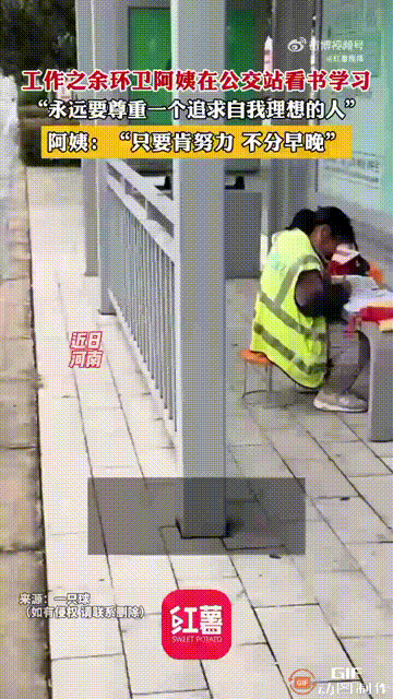 河南一处街头,一名男子回家时,看见一位环卫阿姨在完成工作后,坐在公交车站台的座椅上看书写字,顿时觉得非常感动,事后男子表示,这位阿姨是在看环卫方面的书,学习特别认真,不会的字会自己查清楚,看到时非常震惊,所以忍不住动手拍下来,视频在网络上引起热议后,环卫阿姨也出来回应,特意写下了“只要肯努力,不分早晚”的纸条激励众人,网友看完这段视频,都觉得这位环卫阿姨太让人敬佩了,她虽然年龄已经不小了,做的也是街头清扫的环卫工作,但她却始终有着天天向上的决心,希望用读书来升华自己,在环卫领域能够更加专业,这种热爱学习并且坚持不懈的精神,真的值得很多人学习,正如那句“活到老,学到老”,相信她也会因此变得越来越好。大家怎么看呢?