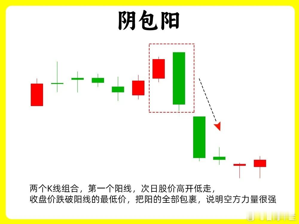 两个K线组合,第一个阳线,次日股价高开低走,收盘价跌破阳线的最低价,把阳的全部包裹,说明空方力量很强,这种走势比较常见,下跌趋势出现比较多。