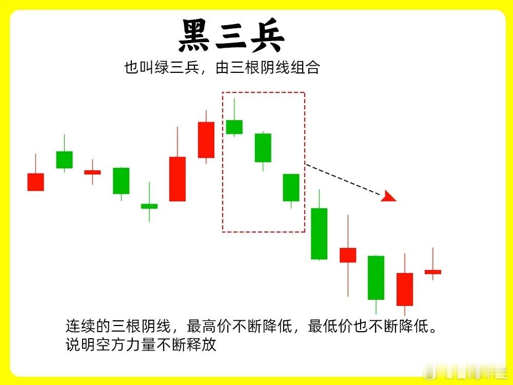 也叫绿三兵,由三根阴线组合。连续的三根阴线,最高价不断降低,最低价也不断降低。说明空方力量不断释放,这种形态往往出现的下跌趋势当中。