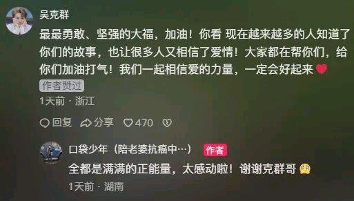 10月11日,吴克群在社交平台发视频,帮抗癌情侣在张家界补办婚礼。患癌女生邹大福是26岁的抗癌博主,7月准备婚礼前夕确诊胃癌晚期,多次化疗也没好转。她不想耽误男友,但男友不离不弃,陪她多地就医、悉心照料。 邹大福接受采访时说,得知吴克群帮她办婚礼又震惊又激动,抗癌时吴克群还给予经济帮助,而且他没明星架子,特别平和。这场婚礼弥补了他们的遗憾,是爱情的见证,也让亲友感动落泪。吴克群这一善举真的太暖啦!