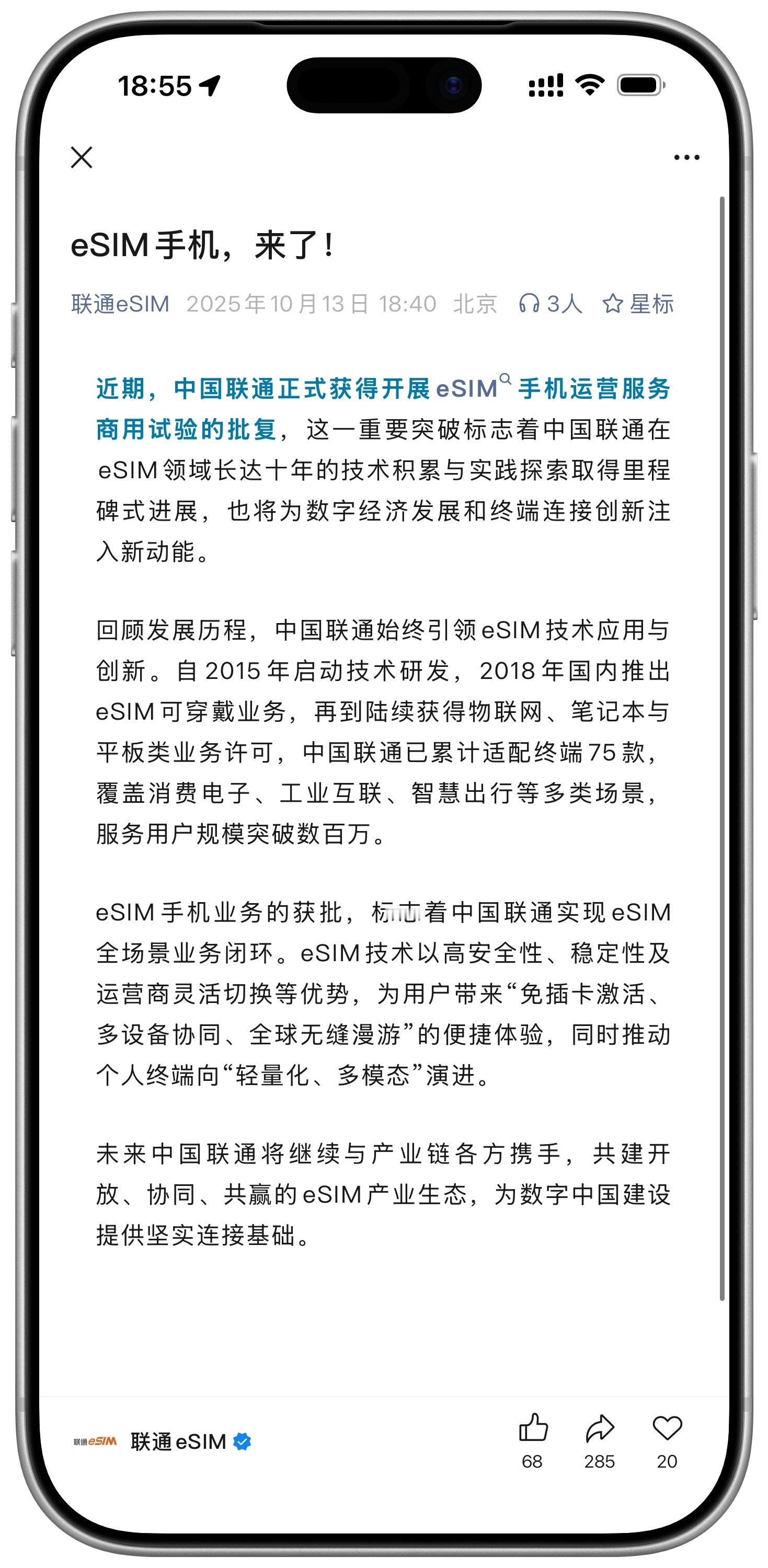 中国联通官宣「已正式获得eSIM手机运营商用试验的批复」。