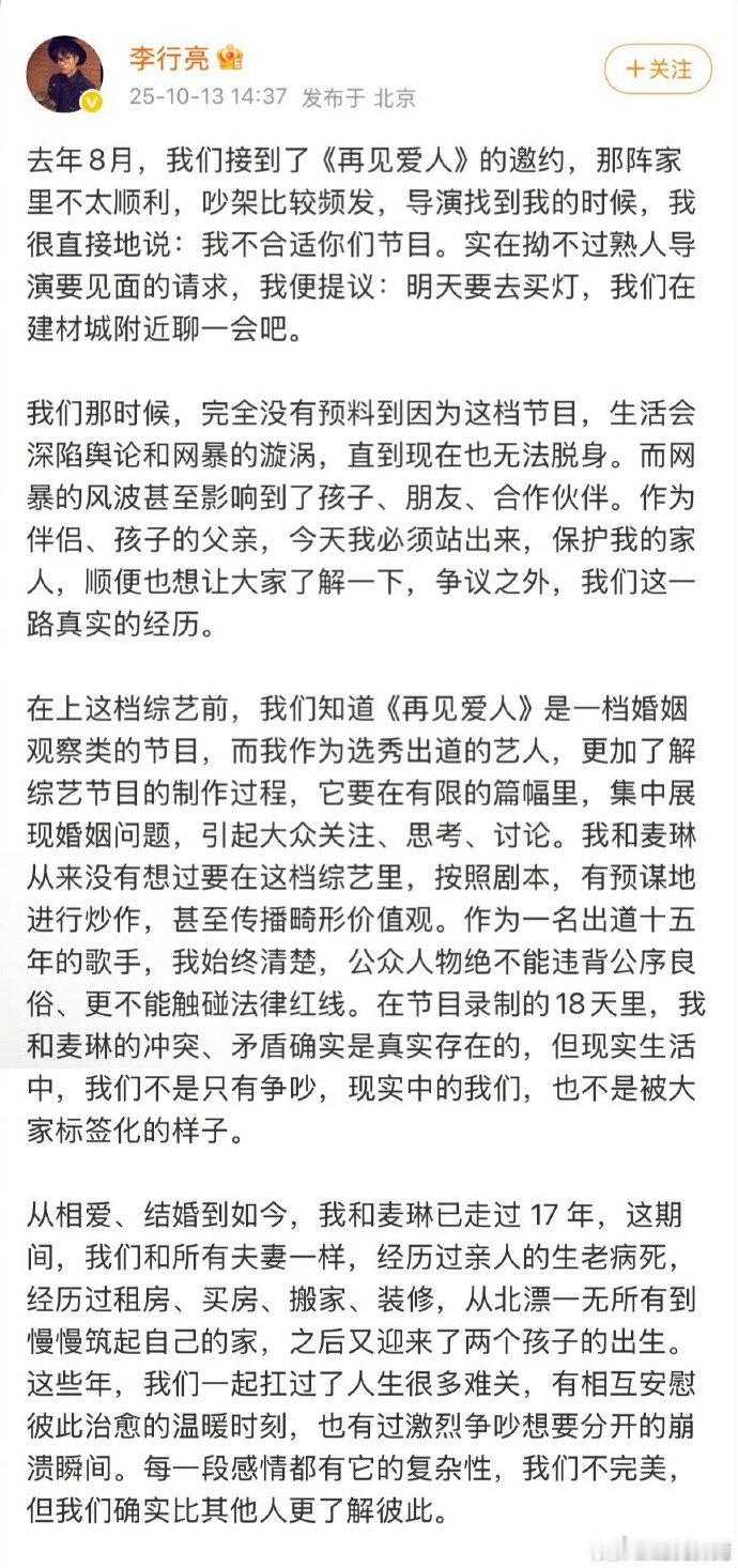 李行亮称因再见爱人深陷网暴李行亮就聊了个《再见爱人》,结果被网暴到生活受影响,那些闲人能不能别管别人的闲事啊!李行亮称网友影响到他的生活李行亮发微博长文维权