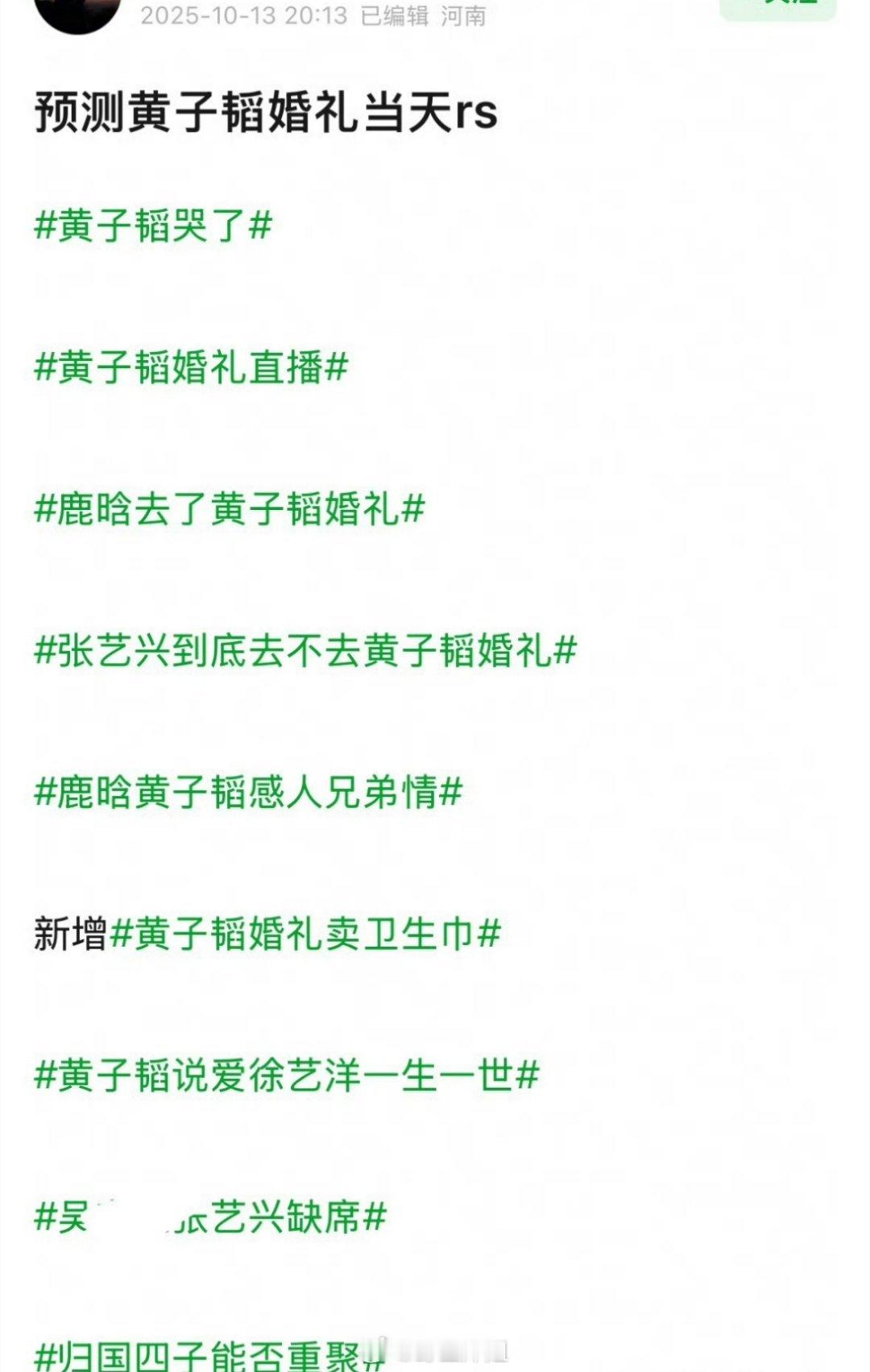 据悉黄子韬跟徐艺洋的婚礼在十月十六号举行,已经有网友提前预测了当初的热搜词了,一