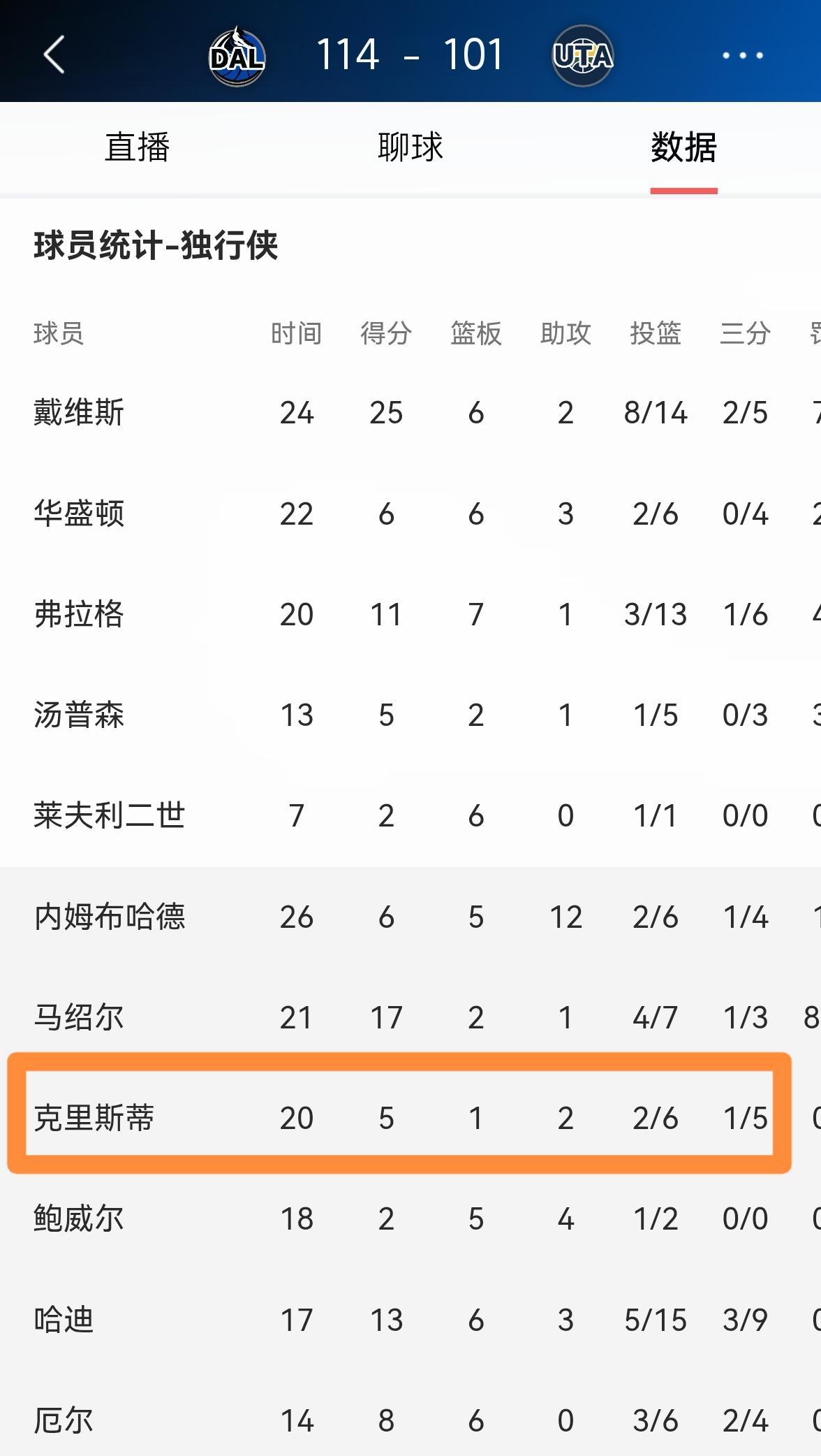 独行侠小将克里斯蒂真是太不争气了!在今天独行侠以114:101击败爵士的季前赛中,克里斯蒂再次丢失了自己的投篮包,全场比赛下来,他替补出战20分钟,投篮6中2,其中三分球5中1非常低效的得到5分。 如今的克里斯蒂和湖人时期相比发生了明显的退步,尤其是他的投篮能力竟然越来越差了。如果克里斯蒂无法提升自己的投射能力,那么他在球队的位置将会变得岌岌可危,这绝对不是危言耸听。