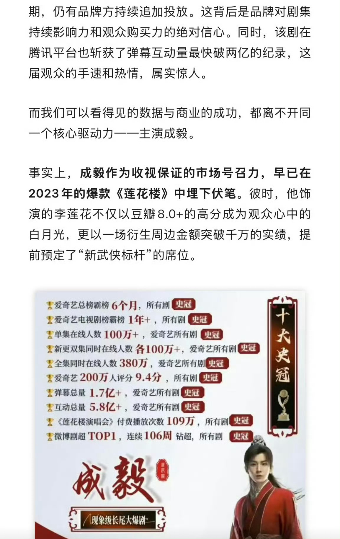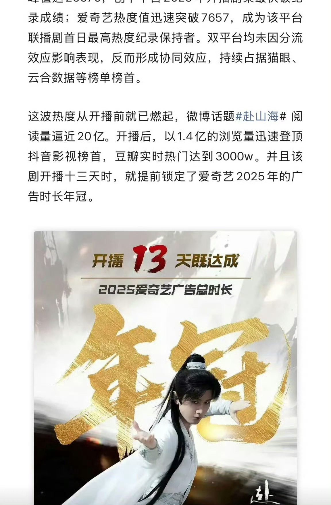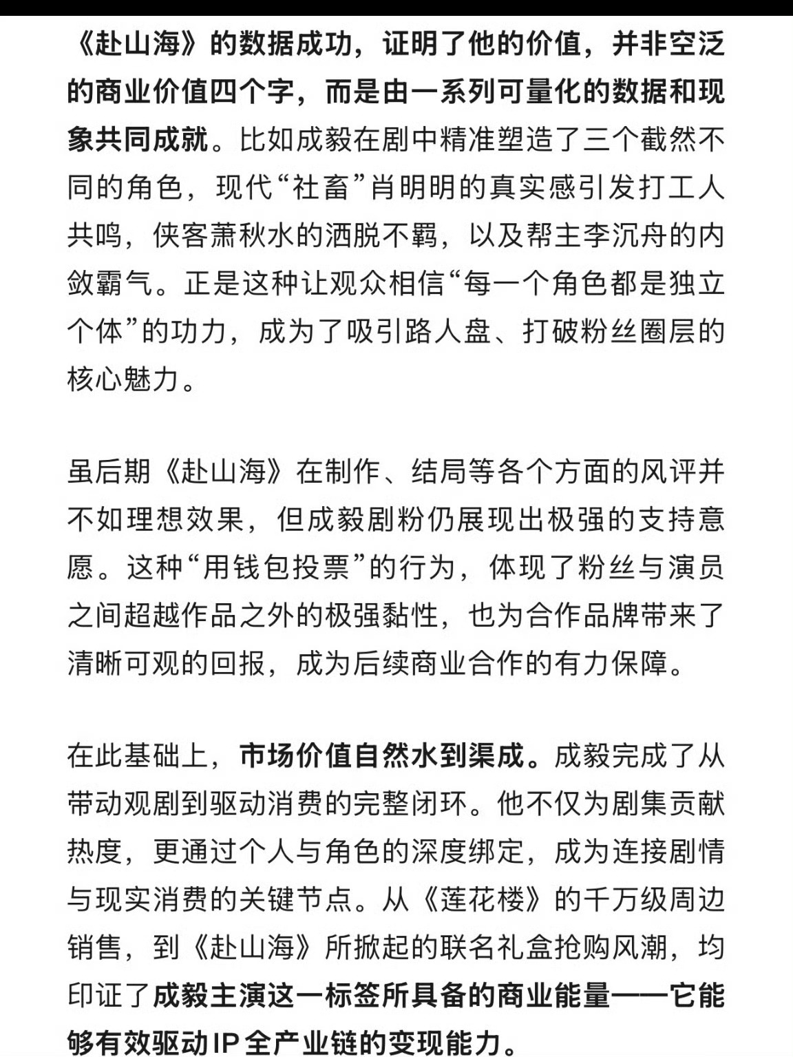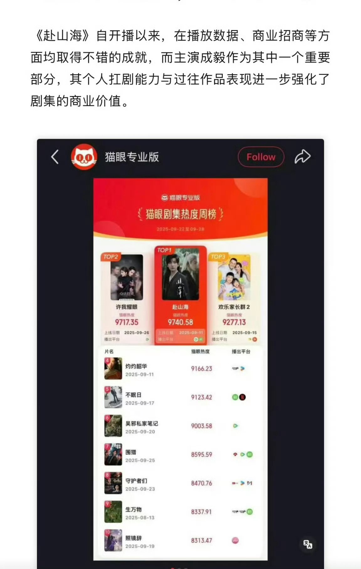 论扛剧能力成毅真的太顶了!成毅《赴山海》赢麻了!各项数据与商业的成功,而主演成毅的扛剧能力再次得到印证!ip衍生开发问鼎2025长剧之冠!